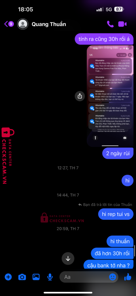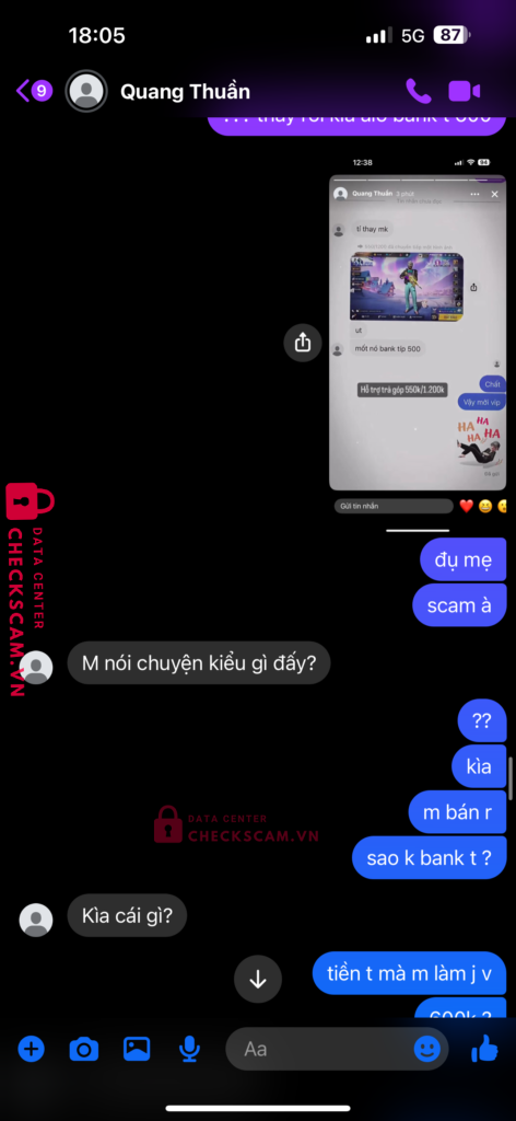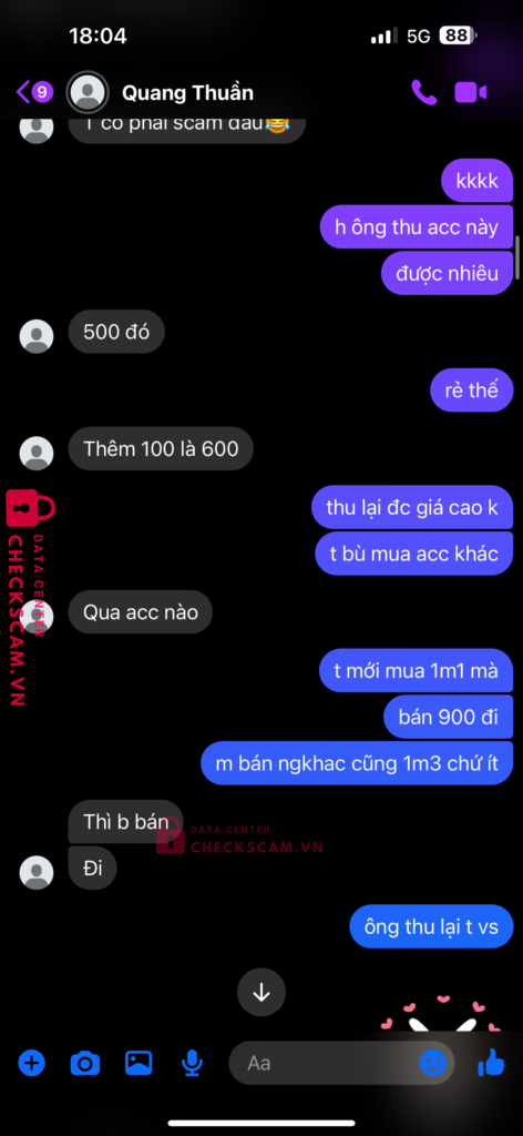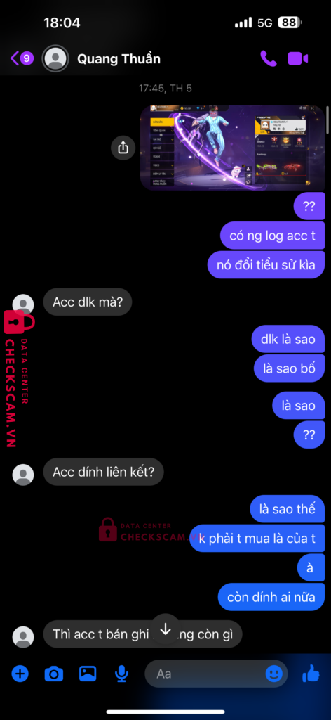 em có mua 1 tài khoản free fire của bạn Quang Thuần này với giá 1tr2 sau đó em mới ngỡ ra là acc dính liên kết tức là nhiều người chơi 1 acc thế em mới ngỏ là bán lại cho bạn í vì em không thích chơi acc dính liên kết thế này . Em gạ mãi thì bạn quang thuần này thu lại được 600 sau khi đổi tất cả các thông tin tài khoản bạn í chối liên tục và bảo là do nhân viên nên bạn í không biết sau đó 1 ngày sau bạn í không trả lời tin nhắn. Và sau đó bạn up story đã bán tài khoản đó cho một bạn khác em nhắn bạn chuyển tiền cho em thì bạn kiếm cớ bảo em thế này kia rồi không chuyển . Lúc đầu mua thì em có gdtg qua Gia Khiêm nên không việc gì . Lúc sau bán lại thì em cũng tin tưởng đưa cho bạn đổi thông tin không ngờ lại thành ra như vậy. Bây giờ bạn í không chuyển em nhắn cũng không trả lời và nick đấy cũng được bán í bán cho người khác. Mong admin duyệt lấy lại công bằng cho em.