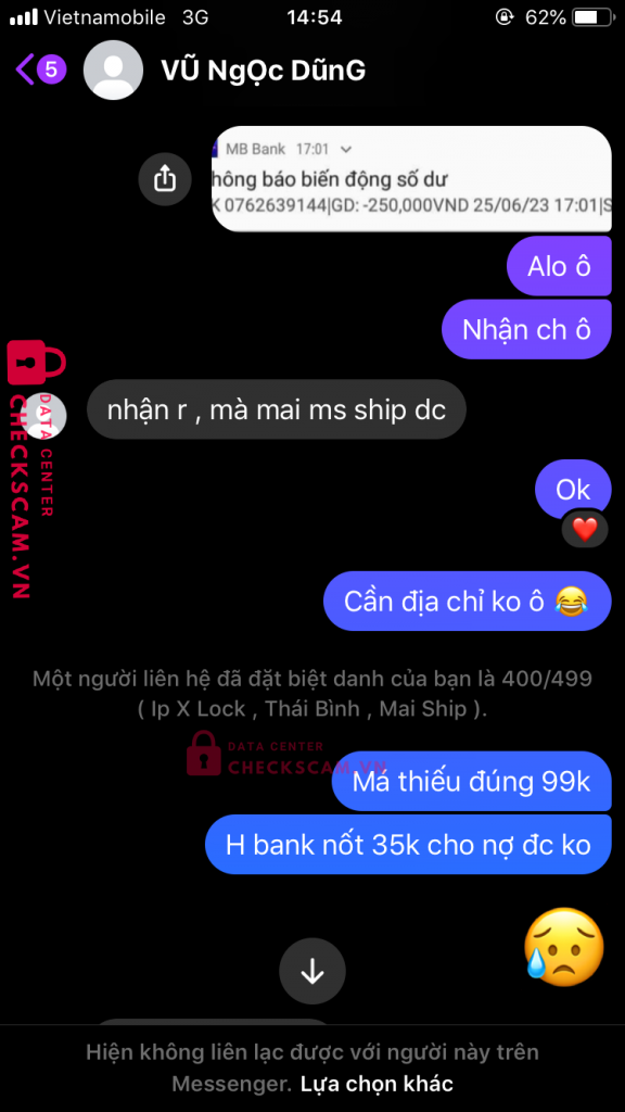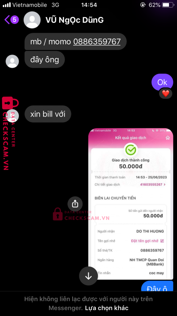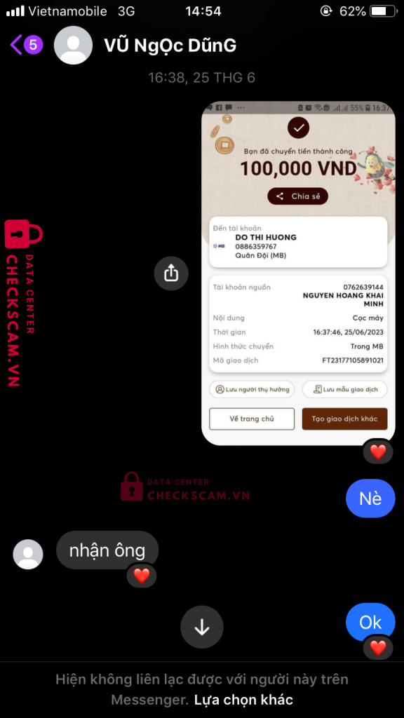 Scammer Alert: Do THI HUONG Reported: November 16, 2024 Scammer Information Full Name: Do THI HUONG Phone Number: 0886359767 Payment Gate: MB Payment Account: 0886359767 Category: Marketplace scams Source: Checkscam Evidence Files Report Description Fb là Vũ Ngọc Dũng ae né nhé mua máy lock qua mạng xog nó block Comments Your comment Add Comment No comments yet. Be the first to share your experience with this scammer.