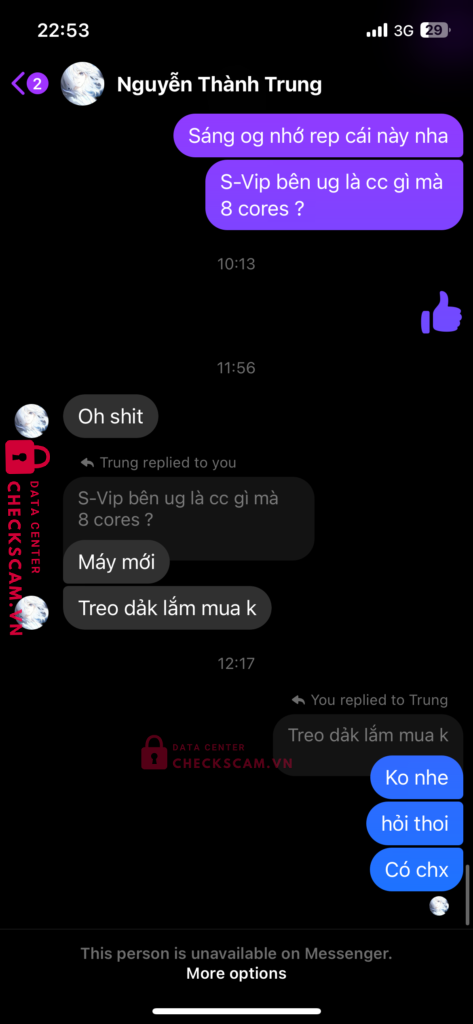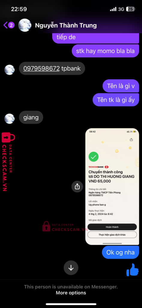 Scammer Alert: Đỗ Thị Hương Giang Reported: November 16, 2024 Scammer Information Full Name: Đỗ Thị Hương Giang Payment Gate: TP Bank Payment Account: 0979598672 Category: Marketplace scams Source: Checkscam Evidence Files Report Description Scam có tổ chức khuyên mn nên né trong việc mua về mấy thứ trong blox fruit và ug phone Comments Your comment Add Comment No comments yet. Be the first to share your experience with this scammer.