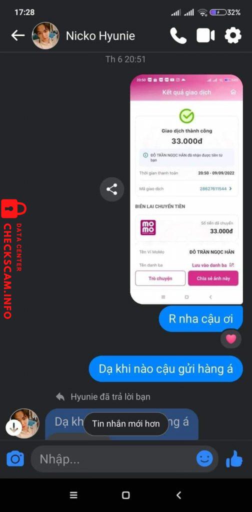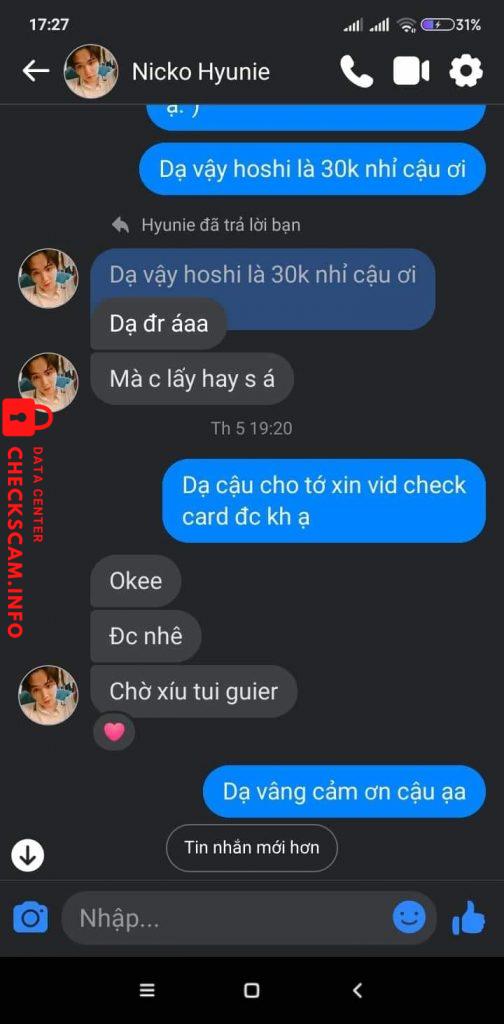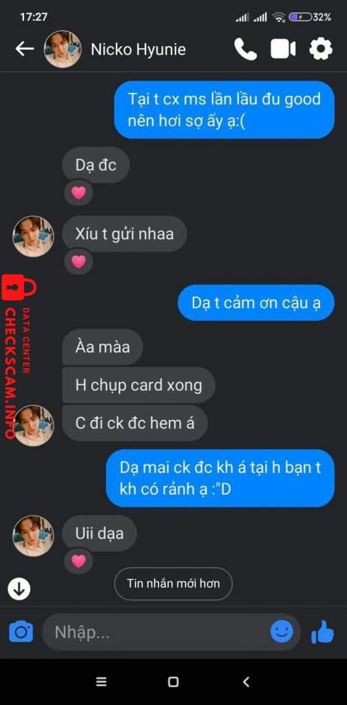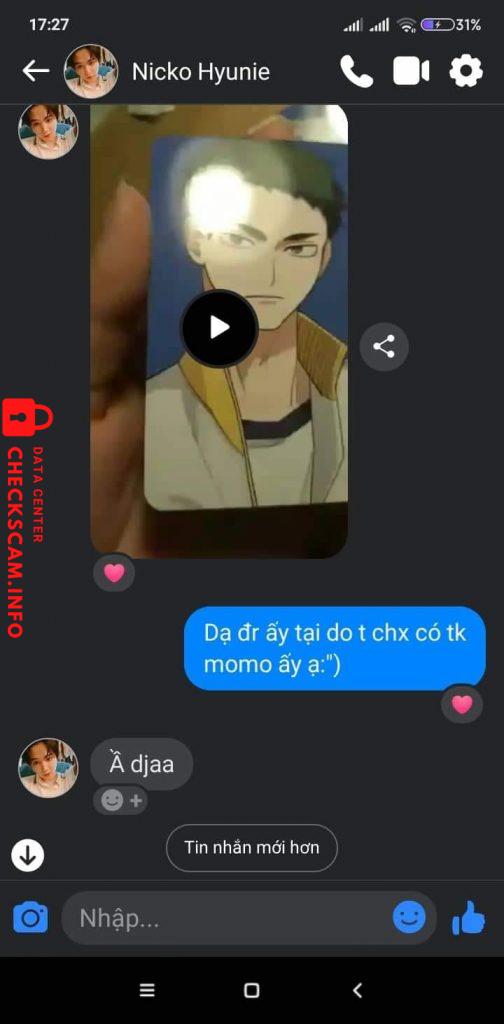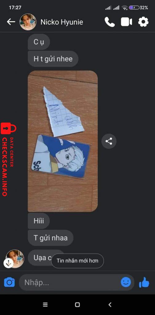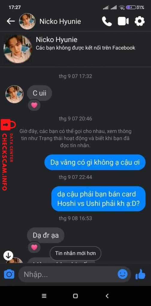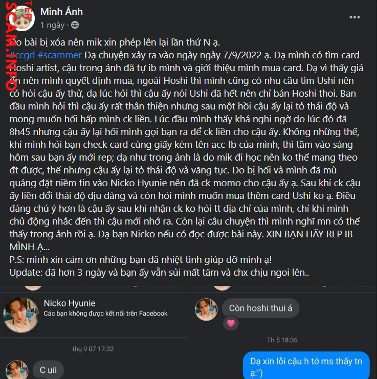 Dạ chuyện xảy ra vào ngày ngày 7/9/2022 ạ. Dạ mình có tìm card Hoshi artist, cậu trong ảnh đã tự ib mình và giới thiệu mình mua card. Dạ vì thấy giá ổn nên mình quyết định mua, ngoài Hoshi thì mình cũng có nhu cầu tìm Ushi nên có hỏi cậu ấy thử, dạ lúc hỏi thì cậu ấy nói Ushi đã hết nên chỉ bán Hoshi thoi. Ban đầu mình hỏi thì cậu ấy rất thân thiện nhưng sau một hồi cậu ấy lại tỏ thái độ và mong muốn hối hấp mình ck liền. Lúc đầu mình thấy khá nghi ngờ do lúc đó đã 8h45 nhưng cậu ấy lại hối mình gọi bạn ra để ck liền cho cậu ấy. Không những thế, khi mình hỏi bạn check card cùng giấy kèm tên acc fb của mình, thì tầm vào sáng hôm sau bạn ấy mới rep; dạ như trong ảnh là do mik đi học nên ko thể mang theo đt được, thế nhưng cậu ấy lại tỏ thái độ và văng tục. Do bị hối và mình đã mù quáng đặt niềm tin vào Nicko Hyunie nên đã ck momo cho cậu ấy ạ. Sau khi ck cậu ấy liền đổi thái độ dịu dàng và còn hỏi mình muốn mua thêm card Ushi ko ạ. Điều đáng chú ý hơn là cậu ấy sau khi nhận ck ko hỏi tt địa chỉ của mình, chỉ khi mình chủ động nhắc đến thì cậu mới nhớ ra. Còn lại câu chuyện thì mình nghĩ mn có thể thấy trong ảnh rồi ạ.