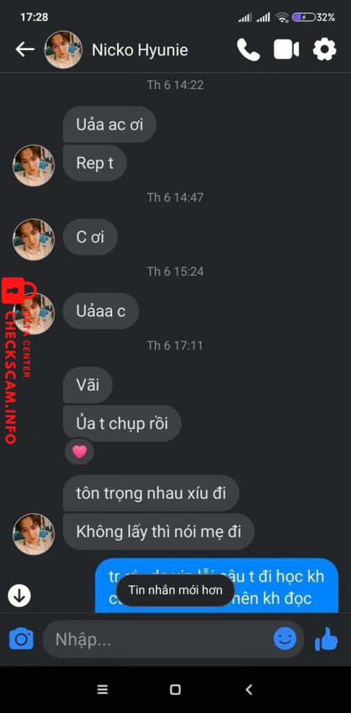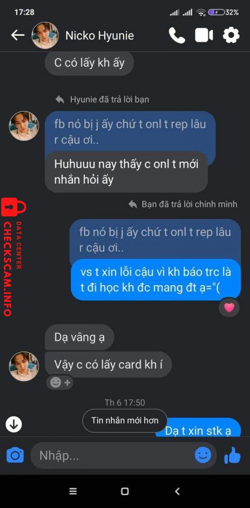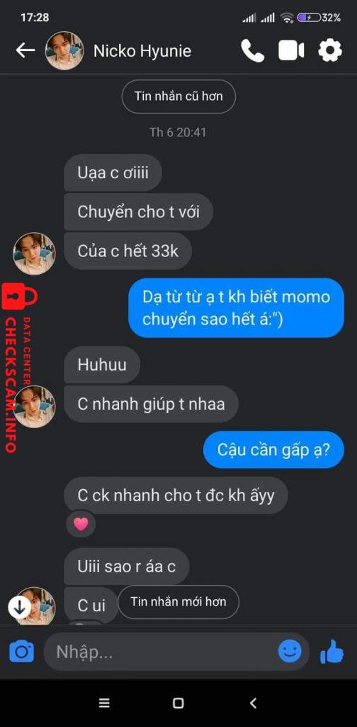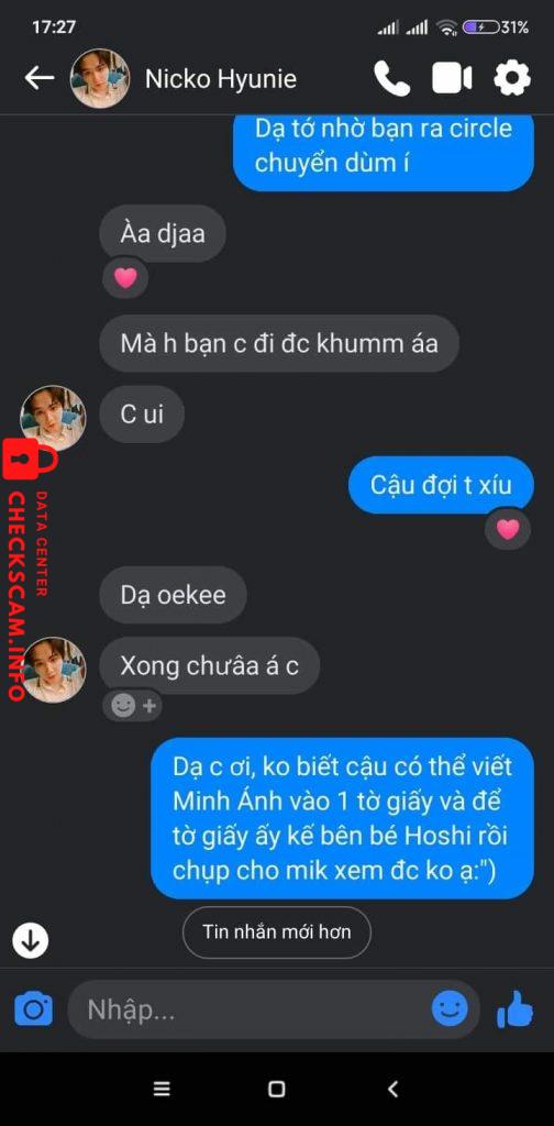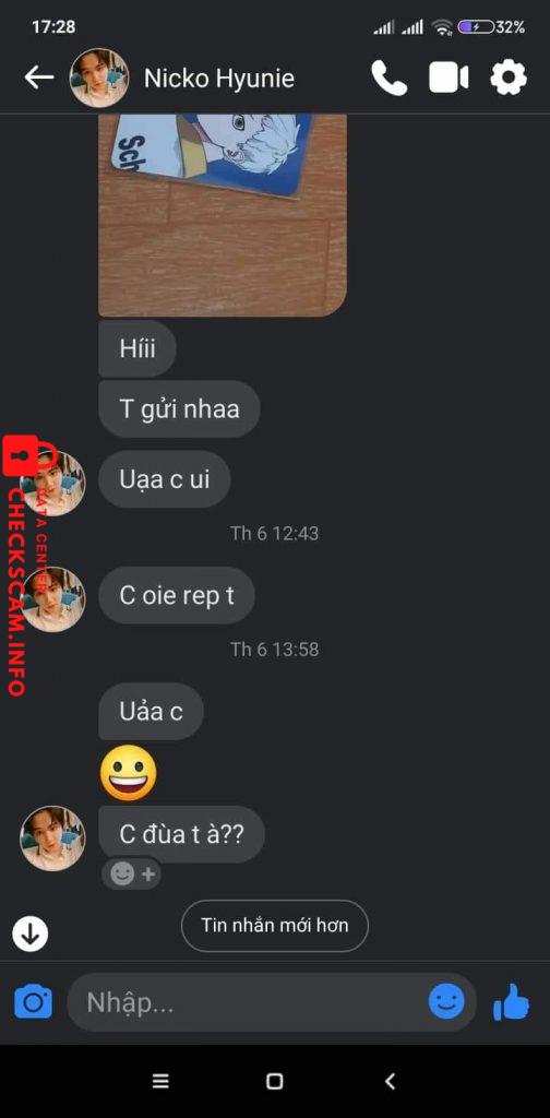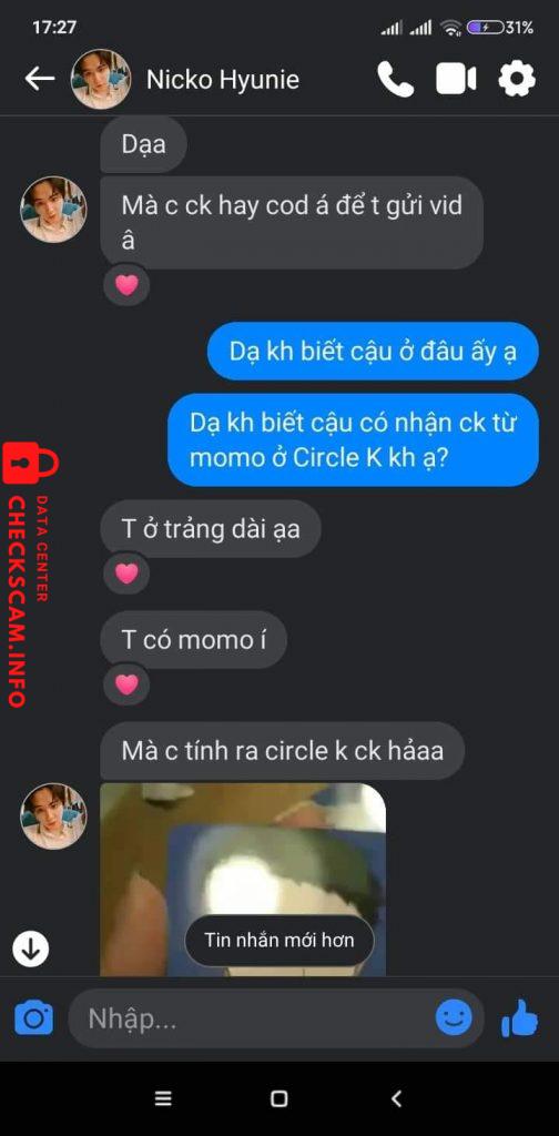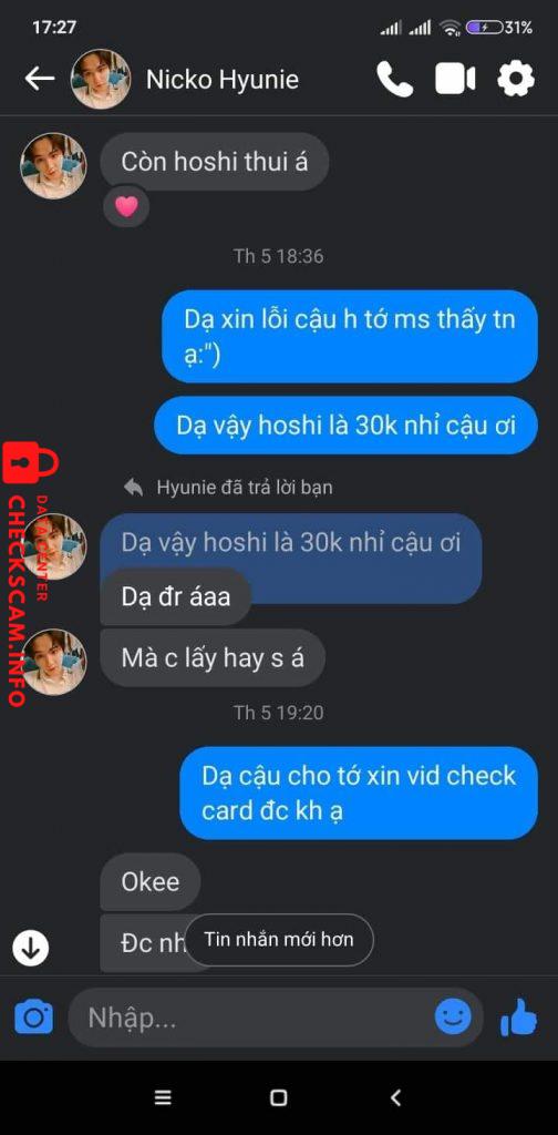 Dạ chuyện xảy ra vào ngày ngày 7/9/2022 ạ. Dạ mình có tìm card Hoshi artist, cậu trong ảnh đã tự ib mình và giới thiệu mình mua card. Dạ vì thấy giá ổn nên mình quyết định mua, ngoài Hoshi thì mình cũng có nhu cầu tìm Ushi nên có hỏi cậu ấy thử, dạ lúc hỏi thì cậu ấy nói Ushi đã hết nên chỉ bán Hoshi thoi. Ban đầu mình hỏi thì cậu ấy rất thân thiện nhưng sau một hồi cậu ấy lại tỏ thái độ và mong muốn hối hấp mình ck liền. Lúc đầu mình thấy khá nghi ngờ do lúc đó đã 8h45 nhưng cậu ấy lại hối mình gọi bạn ra để ck liền cho cậu ấy. Không những thế, khi mình hỏi bạn check card cùng giấy kèm tên acc fb của mình, thì tầm vào sáng hôm sau bạn ấy mới rep; dạ như trong ảnh là do mik đi học nên ko thể mang theo đt được, thế nhưng cậu ấy lại tỏ thái độ và văng tục. Do bị hối và mình đã mù quáng đặt niềm tin vào Nicko Hyunie nên đã ck momo cho cậu ấy ạ. Sau khi ck cậu ấy liền đổi thái độ dịu dàng và còn hỏi mình muốn mua thêm card Ushi ko ạ. Điều đáng chú ý hơn là cậu ấy sau khi nhận ck ko hỏi tt địa chỉ của mình, chỉ khi mình chủ động nhắc đến thì cậu mới nhớ ra. Còn lại câu chuyện thì mình nghĩ mn có thể thấy trong ảnh rồi ạ.