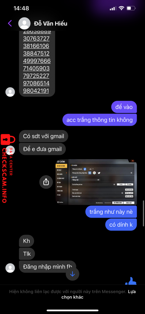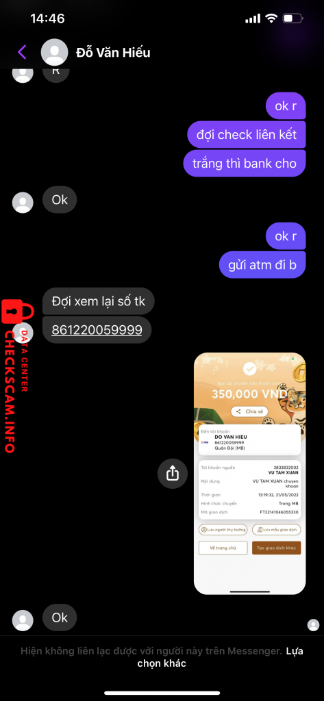 Scammer Alert: Đỗ Văn Hiếu Reported: November 16, 2024 Scammer Information Full Name: Đỗ Văn Hiếu Phone Number: 861220059999 Payment Gate: MBbank Payment Account: 861220059999 Category: Marketplace scams Source: Checkscam Evidence Files Report Description Back acc mọi người cẩn thận nhé Comments Your comment Add Comment No comments yet. Be the first to share your experience with this scammer.