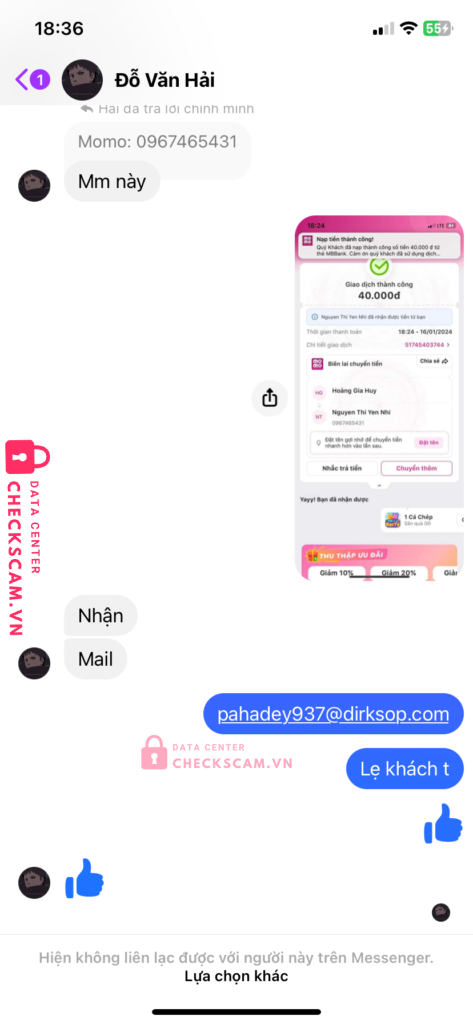 Scammer Alert: DO VAN THANH Reported: November 16, 2024 Scammer Information Full Name: DO VAN THANH Payment Gate: Momo VCP Payment Account: 0967465431VCB9967465431 Category: Marketplace scams Source: Checkscam Evidence Files Report Description Thằng này trùm scam anh em né nhé Lợi dùng lòng tin và giá thành rẻ để lừa đảo cảnh giác Comments Your comment Add Comment No comments yet. Be the first to share your experience with this scammer.