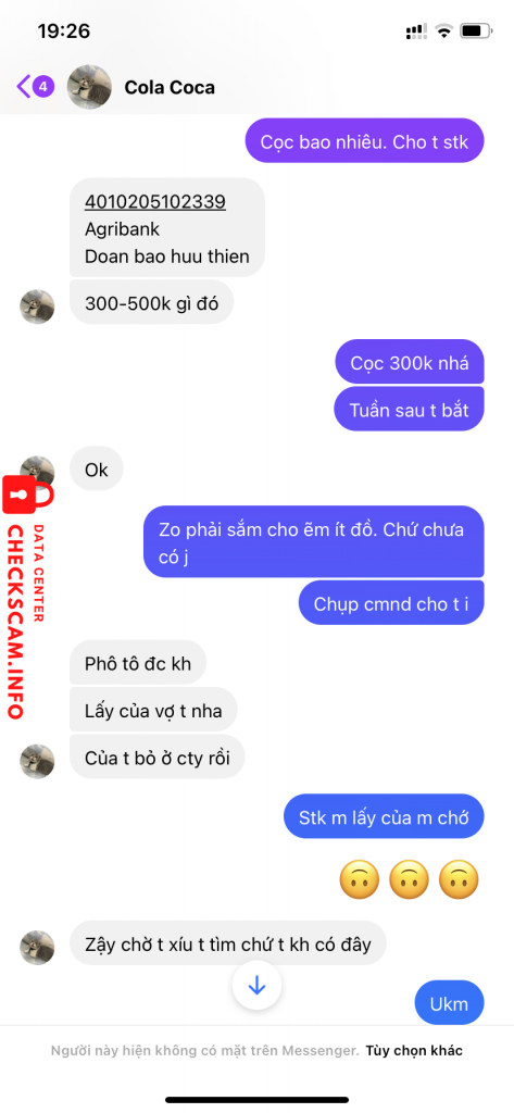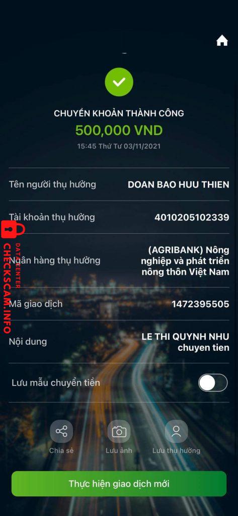 Scammer Alert: Đoàn Bảo Hữu Thiên Reported: November 16, 2024 Scammer Information Full Name: Đoàn Bảo Hữu Thiên Payment Gate: Agribank Payment Account: 4010205102339 Category: Marketplace scams Source: Checkscam Evidence Files Report Description Lừa đảo Comments Your comment Add Comment No comments yet. Be the first to share your experience with this scammer.