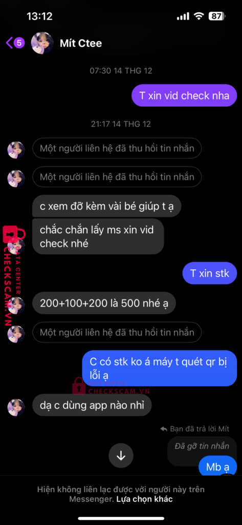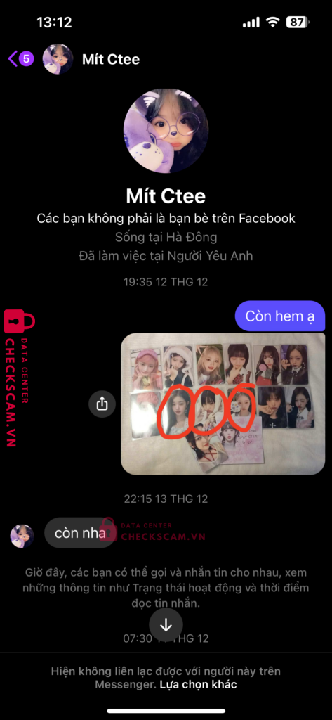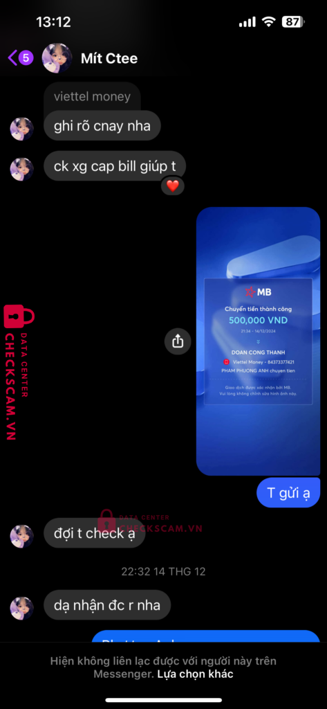 Scammer Alert: DOAN CONG THANH Reported: March 7, 2025 Scammer Information Full Name: DOAN CONG THANH Payment Gate: Viettel money Payment Account: 84373377421 Category: Marketplace scams Source: Checkscam Evidence Files Report Description Tôi mua bên này hết 500k, 10 ngày sau bị block và quỵt Comments Your comment Add Comment No comments yet. Be the first to share your experience with this scammer.