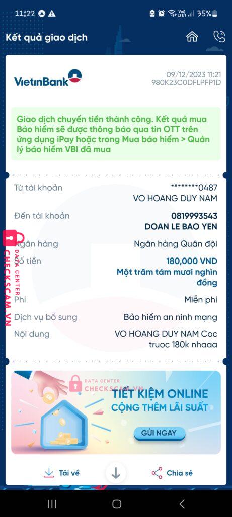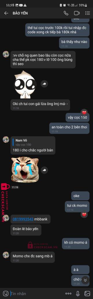 Scammer Alert: Đoàn Lê Bảo Yến Reported: November 16, 2024 Scammer Information Full Name: Đoàn Lê Bảo Yến Payment Gate: MBBank Payment Account: 0819993543 Category: Marketplace scams Source: Checkscam Evidence Files Report Description mình có mua code game 1tr của 1 bạn và mọi bằng chứng đều có trên tin nhắn zalo cả Comments Your comment Add Comment No comments yet. Be the first to share your experience with this scammer.