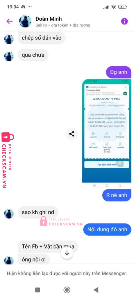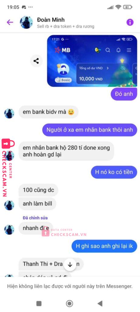Scammer Alert: Đoàn Minh Tuấn Reported: March 7, 2025 Scammer Information Full Name: Đoàn Minh Tuấn Payment Gate: Mb bank Payment Account: 0798881305 Category: Marketplace scams Source: Checkscam Evidence Files Report Description Scam lừa đảo dùng sdt chính chủ Mong bên check scam nếu được thì gọi điện răn đe Comments Your comment Add Comment No comments yet. Be the first to share your experience with this scammer.