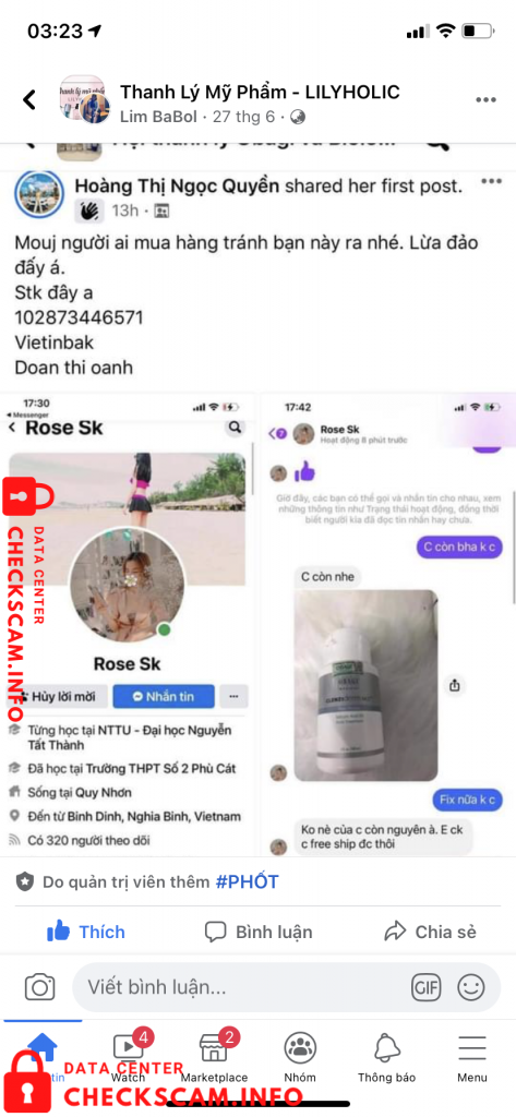 Scammer Alert: Doan Thi Oanh Reported: November 16, 2024 Scammer Information Full Name: Doan Thi Oanh Payment Gate: VIETINBANK Payment Account: 102873446571 Category: Marketplace scams Source: Checkscam Evidence Files Report Description Cảnh báo lừa đảo cho mọi người trong group ạ, vì em vừa thấy bị phốt bên group khác thì thấy bạn đó pass hàng trên group này ạ Comments Your comment Add Comment No comments yet. Be the first to share your experience with this scammer.