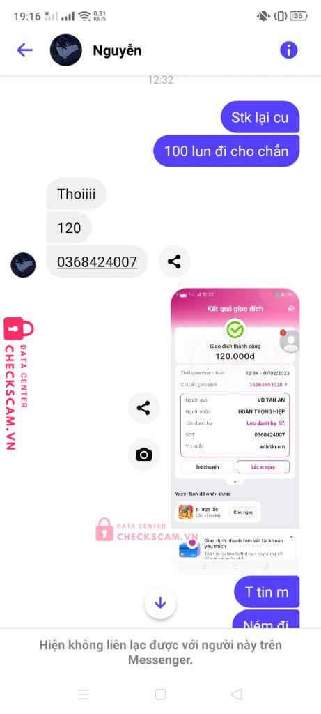 Scammer Alert: Đoàn Trọng Hiệp Reported: November 16, 2024 Scammer Information Full Name: Đoàn Trọng Hiệp Phone Number: 0368424007 Payment Gate: Momo Payment Account: 0368424007 Category: Marketplace scams Source: Checkscam Evidence Files Report Description scam tiền mua acc ạ Comments Your comment Add Comment No comments yet. Be the first to share your experience with this scammer.