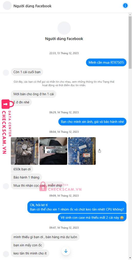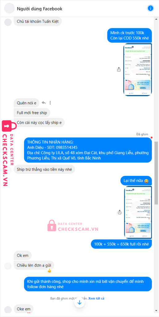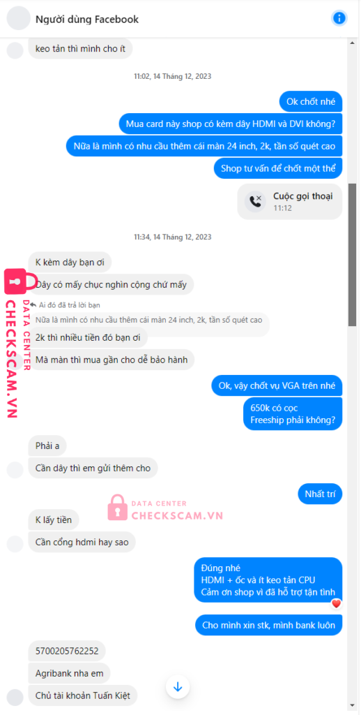 Scammer Alert: DOAN XUAN TUAN KIET Reported: November 16, 2024 Scammer Information Full Name: DOAN XUAN TUAN KIET Payment Gate: Agribank Payment Account: 5700205762252 Category: Marketplace scams Source: Checkscam Evidence Files Report Description – Mình mua card màn hình VGA 750ti. Nó báo giá 650k bank full thì free ship – Bank xong nó chặn Comments Your comment Add Comment No comments yet. Be the first to share your experience with this scammer.
