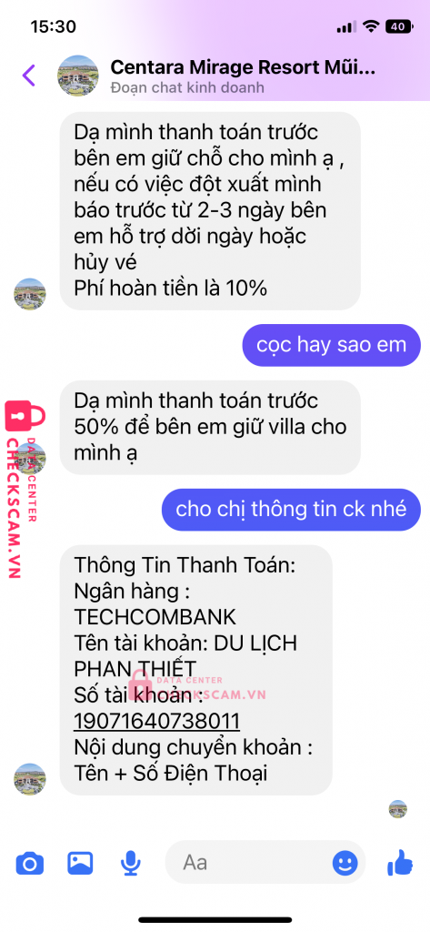 Scammer Alert: DU LỊCH PHAN THIẾT Reported: November 16, 2024 Scammer Information Full Name: DU LỊCH PHAN THIẾT Payment Gate: TECHCOMBANK Payment Account: 19071640738011 Category: Marketplace scams Source: Checkscam Evidence Files Report Description Page này cùng giuộc với Du lịch Mũi Né, giả mạo Resort khác để lừa tiền khách hàng Comments Your comment Add Comment No comments yet. Be the first to share your experience with this scammer.