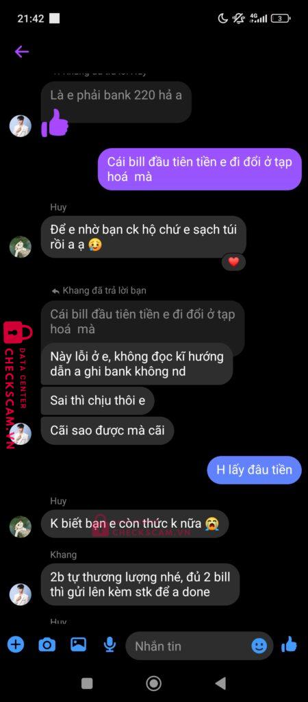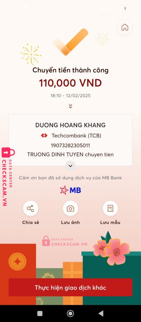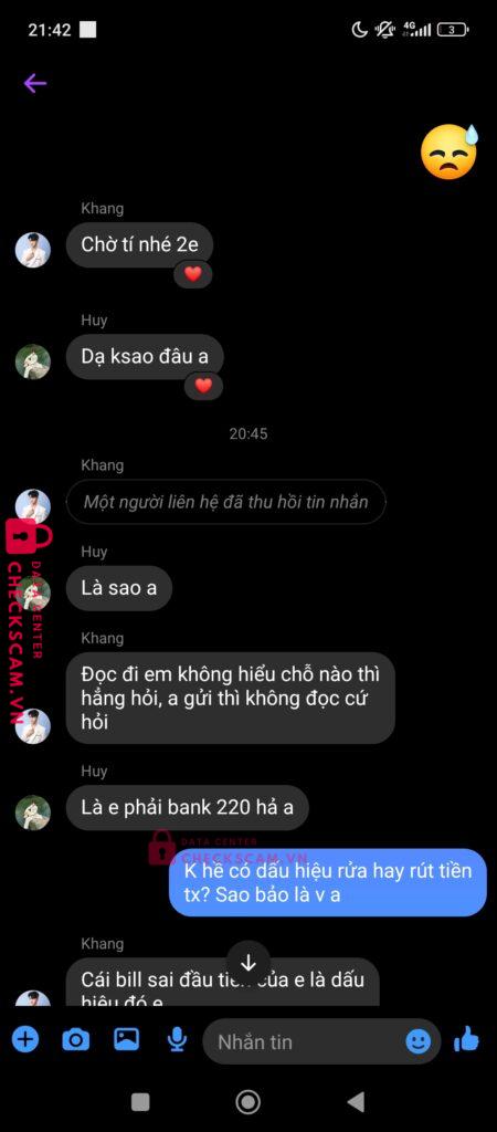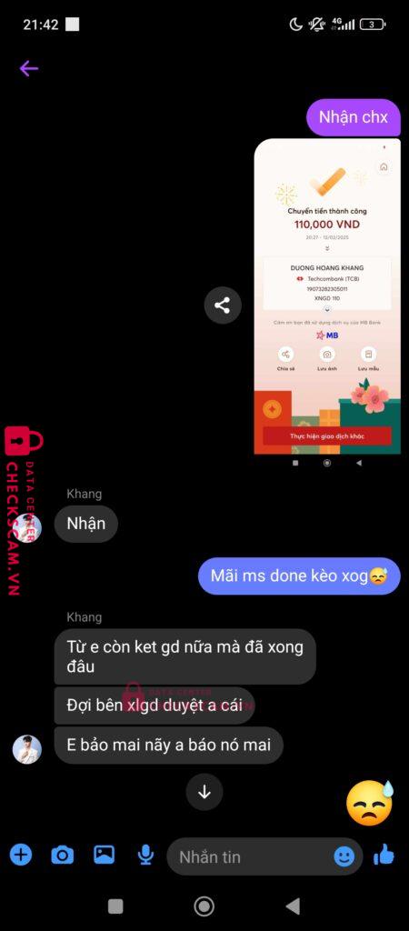 Scammer Alert: Duong Hoàng Khang Reported: March 7, 2025 Scammer Information Full Name: Duong Hoàng Khang Payment Gate: Kỹ thương (TCB) Payment Account: 19073282305011 Category: Marketplace scams Source: Checkscam Evidence Files Report Description Tôi mua acc , vì vậy nói gdtg . Cả 2 đồng ý . Nhưng ông khang hoá ra là đồng bọn của nhau đã thông đồng và lừa tiền tôi 220 Comments Your comment Add Comment No comments yet. Be the first to share your experience with this scammer.