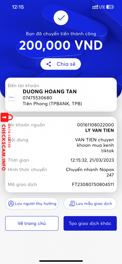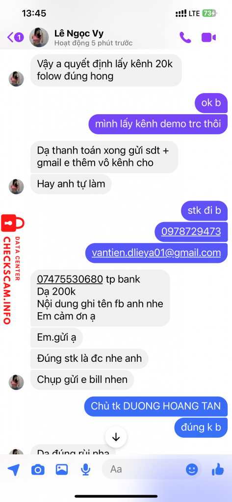 Scammer Alert: DUONG HOANG TAN Reported: November 16, 2024 Scammer Information Full Name: DUONG HOANG TAN Payment Gate: TPBANK Payment Account: 07475530680 Category: Marketplace scams Source: Checkscam Evidence Files Report Description Scam Comments Your comment Add Comment No comments yet. Be the first to share your experience with this scammer.