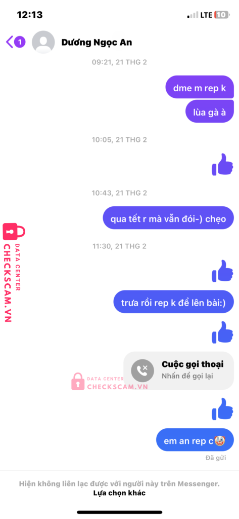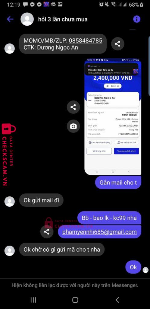 Scammer Alert: Dương Ngọc An Reported: November 16, 2024 Scammer Information Full Name: Dương Ngọc An Payment Gate: MOMO/MB/ZLP Payment Account: 0858484785 Category: Marketplace scams Source: Checkscam Evidence Files Report Description Comments Your comment Add Comment No comments yet. Be the first to share your experience with this scammer.