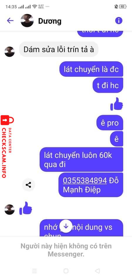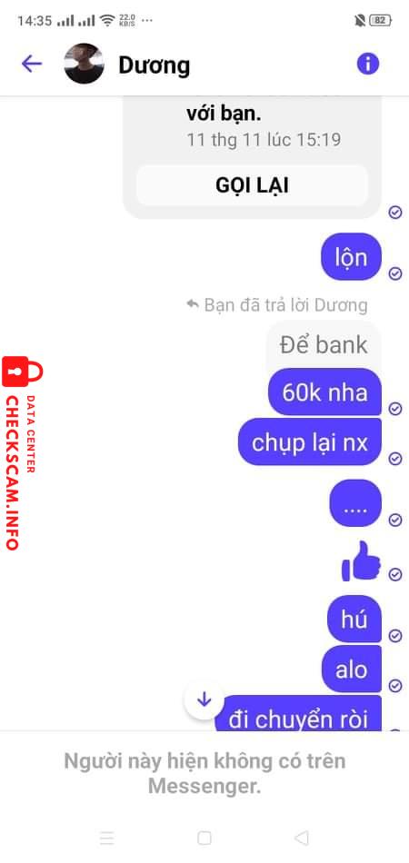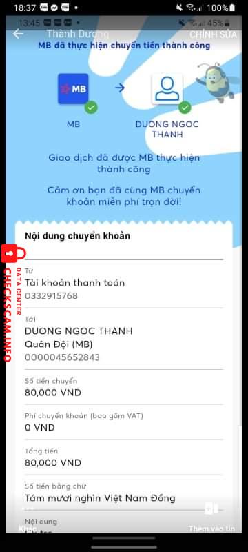 Scammer Alert: Duong Ngoc Thanh Reported: November 16, 2024 Scammer Information Full Name: Duong Ngoc Thanh Payment Gate: MB BANK Payment Account: 0000045652843 Category: Marketplace scams Source: Checkscam Evidence Files Report Description Scam quá đáng.mong ad xem xét Comments Your comment Add Comment No comments yet. Be the first to share your experience with this scammer.
