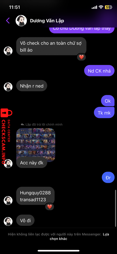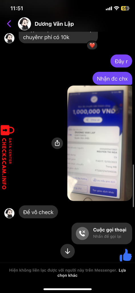 Scammer Alert: DUONG VAN LAP Reported: November 16, 2024 Scammer Information Full Name: DUONG VAN LAP Phone Number: 0397174970 Payment Gate: Mb bank Payment Account: 0397174970 Category: Marketplace scams Source: Checkscam Evidence Files Report Description Nó không nhận tg Comments Your comment Add Comment No comments yet. Be the first to share your experience with this scammer.