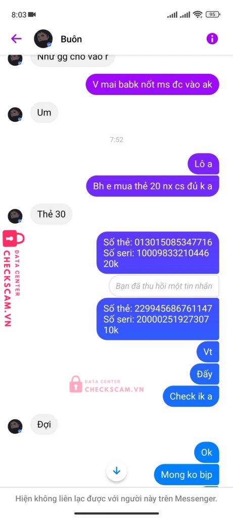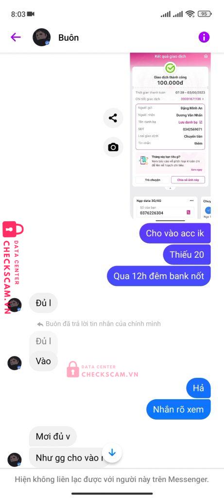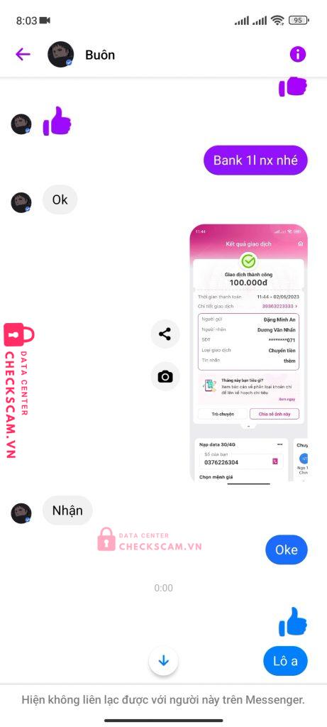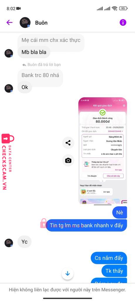 Scammer Alert: DUONG VAN NHAN Reported: November 16, 2024 Scammer Information Full Name: DUONG VAN NHAN Phone Number: 0342569071 Payment Gate: Mb Bank Payment Account: 0342569071 Category: Marketplace scams Source: Checkscam Evidence Files Report Description Lừa đảo Comments Your comment Add Comment No comments yet. Be the first to share your experience with this scammer.