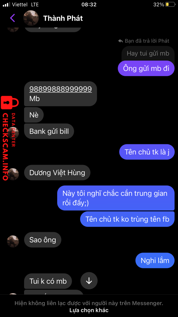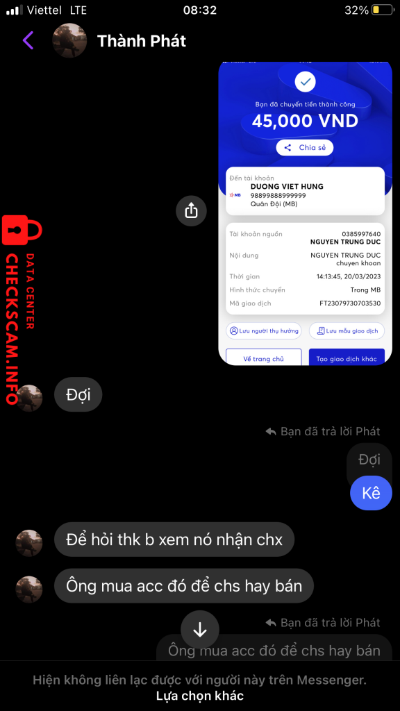 Scammer Alert: Dương Việt Hùng Reported: November 16, 2024 Scammer Information Full Name: Dương Việt Hùng Payment Gate: MB bank Payment Account: 98899888999999 Category: Marketplace scams Source: Checkscam Evidence Files Report Description Thg này nó scam mất toi 45k Comments Your comment Add Comment No comments yet. Be the first to share your experience with this scammer.