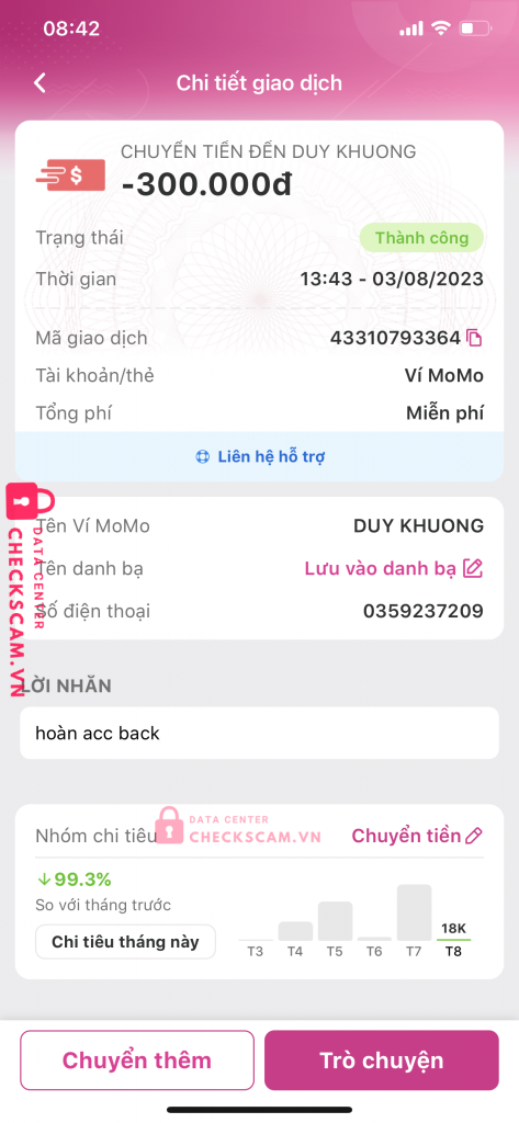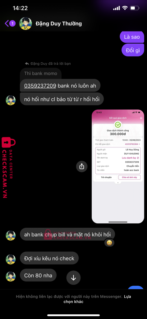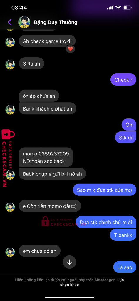 Vào khoảng 13h33 ngày 04/08/2023 , tôi và bạn Đặng Duy Thường có mua bán giao dịch acc game . Tới khi chuyển tiền thì bạn ấy bảo tôi là gửi tiền vào số tài khoản momo 0359237209 với nội dung là “Hoàn acc back” . Vài phút sau khi giao dịch thì tôi thấy tài khoản bị đổi thông tin , khi tôi hỏi lại bạn Đặng Duy Thường thì bạn đó đã chặn tin nhắn tôi