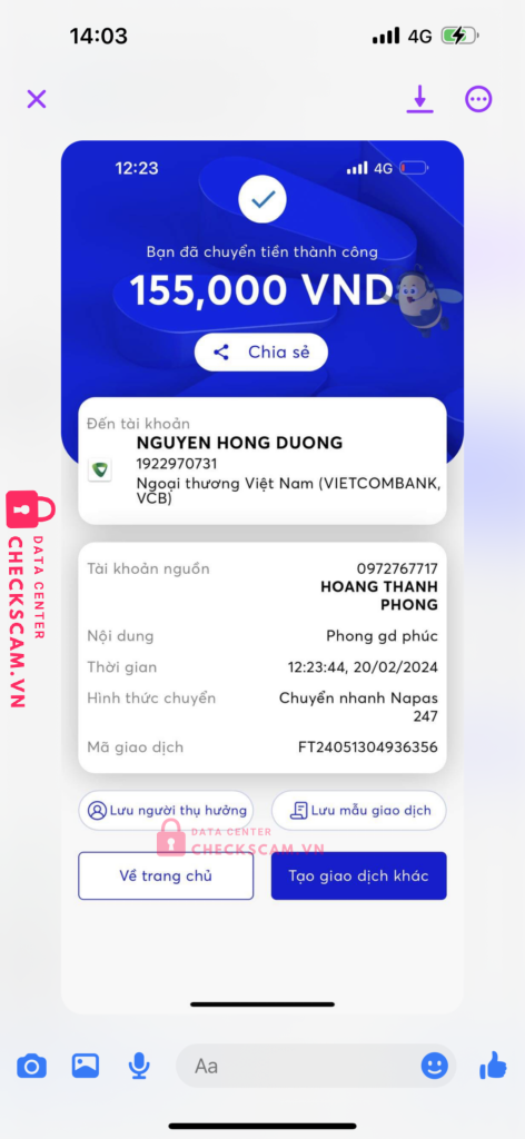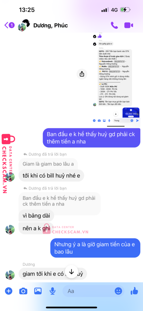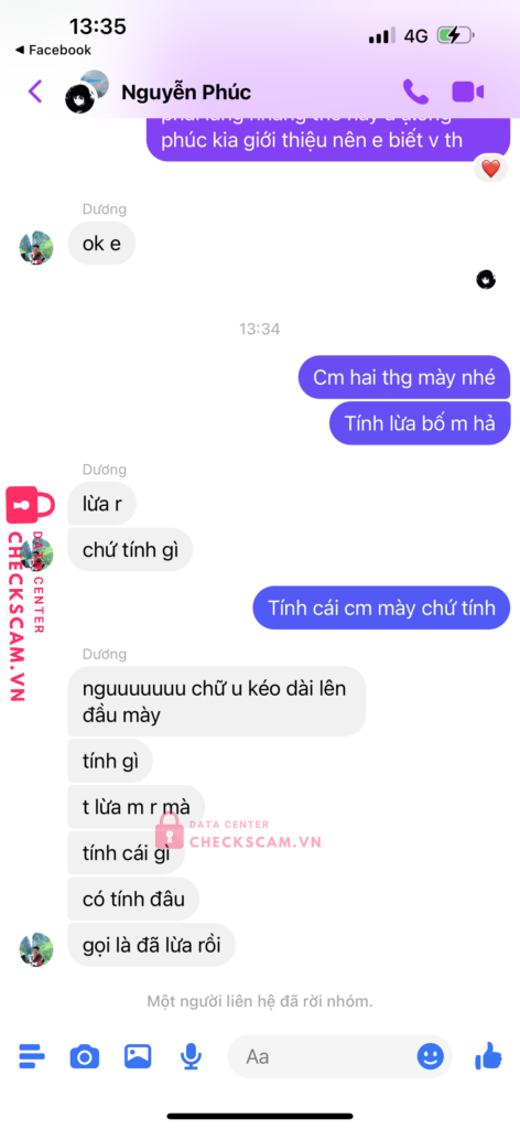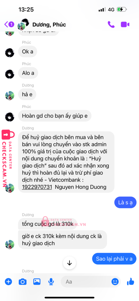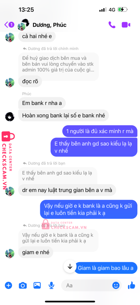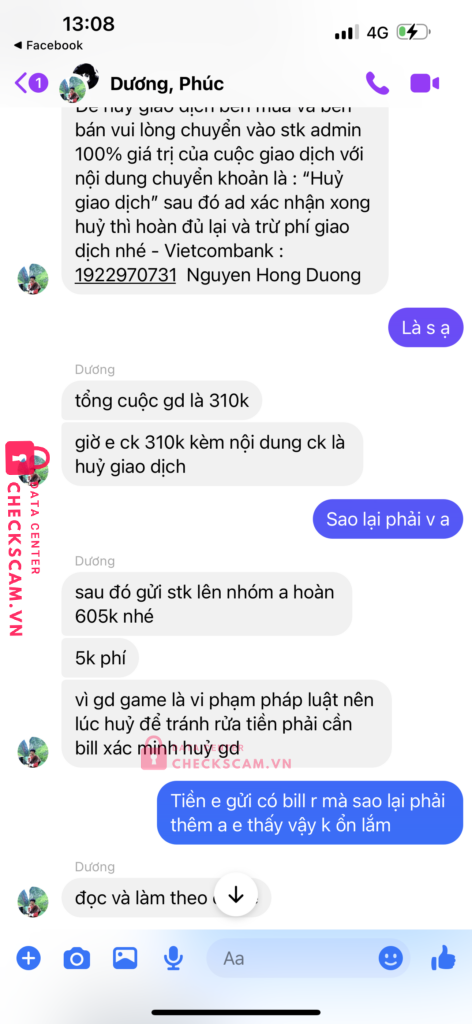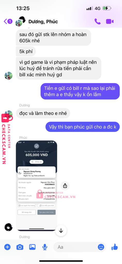 Mình có mua nick game của phúc,và phúc giới thiệu dương là người trung gian dương chính là người lừa đảo mình.sau khi mình bắn tiền cho dương để làm trung gian thì phúc sẽ phải đưa nick game cho mình nhưng phúc lại nói là nick game bị người khác phá nên phải huỷ giao dịch.mình có nhắn tin cho dương kêu huỷ giao dịch thì dương lại kêu mình phải bắn thêm tiền bằng số tiền mua nick cho dương thì dương mới chả lại tiền cho mình.mình thấy có dầu hiệu lừa đảo nên k đồng ý và sau đó thì cả dương và phúc đã chặn facebook của mình thì mình mới biết là 2 người này cấu kết với nhau để lừa mình.