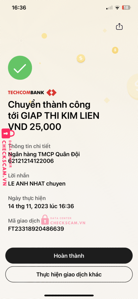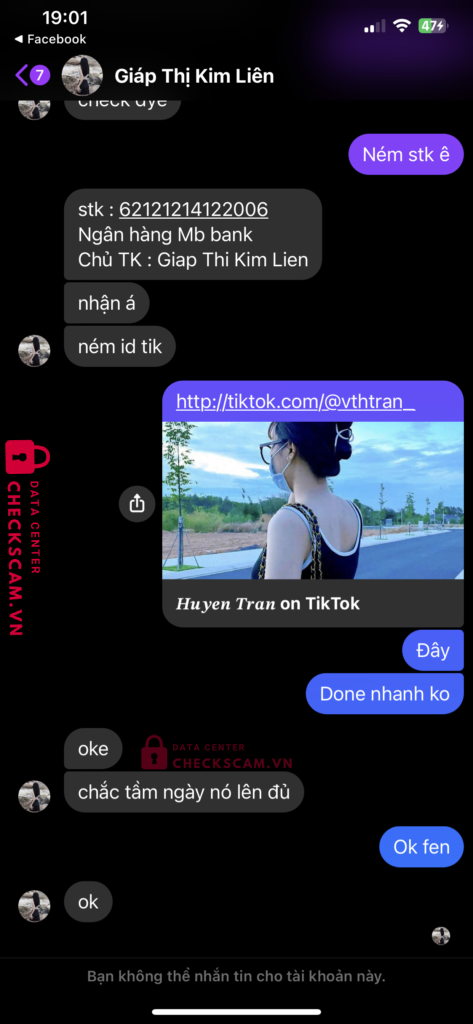 Scammer Alert: Giáp Thị Kim Liên Reported: November 16, 2024 Scammer Information Full Name: Giáp Thị Kim Liên Payment Gate: MB Bank Payment Account: 62121214122006 Category: Marketplace scams Source: Checkscam Evidence Files Report Description Buff sub tiktok bank xong block Comments Your comment Add Comment No comments yet. Be the first to share your experience with this scammer.