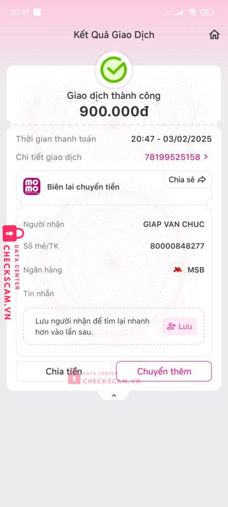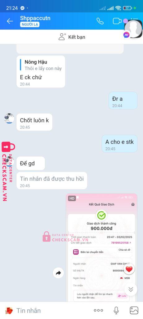 Scammer Alert: GIAP VAN CHUC Reported: March 7, 2025 Scammer Information Full Name: GIAP VAN CHUC Payment Gate: NH TMCP Hang Hai VN Payment Account: 80000848277 Category: Marketplace scams Source: Checkscam Evidence Files Report Description Scam Comments Your comment Add Comment No comments yet. Be the first to share your experience with this scammer.