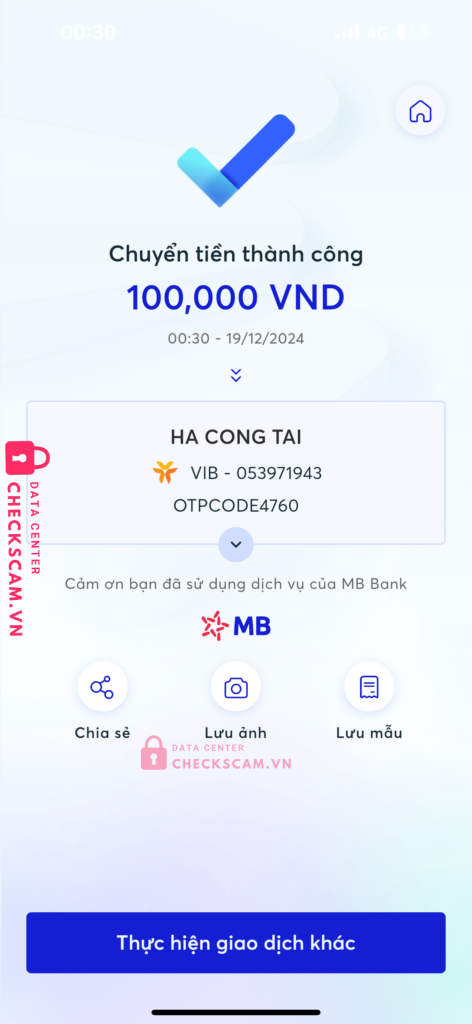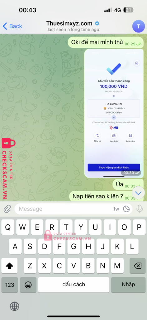 Scammer Alert: HA CONG TAI Reported: March 7, 2025 Scammer Information Full Name: HA CONG TAI Payment Gate: VIB Payment Account: 053971943 Category: Marketplace scams Source: Checkscam Evidence Files Report Description Lừa đảo , scam thuê sim otp Comments Your comment Add Comment No comments yet. Be the first to share your experience with this scammer.