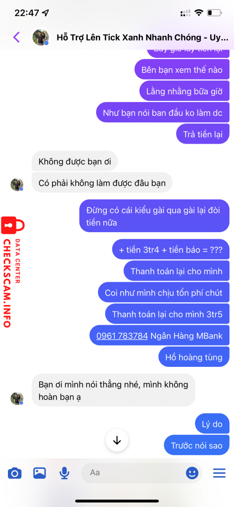 Scammer Alert: Ha duy tuan Reported: November 16, 2024 Scammer Information Full Name: Ha duy tuan Phone Number: 0986824356 Payment Gate: Mbank Payment Account: 390090687777 Category: Marketplace scams Source: Checkscam Evidence Files Report Description Lừa đảo lên tích xanh facebook Comments Your comment Add Comment No comments yet. Be the first to share your experience with this scammer.