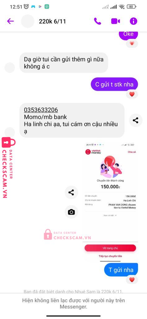 Scammer Alert: HÀ LINH CHI Reported: November 16, 2024 Scammer Information Full Name: HÀ LINH CHI Payment Gate: Momo / MBBank Payment Account: 0353633206 Category: Marketplace scams Source: Checkscam Evidence Files Report Description K8 scam hơn 6m Comments Your comment Add Comment No comments yet. Be the first to share your experience with this scammer.