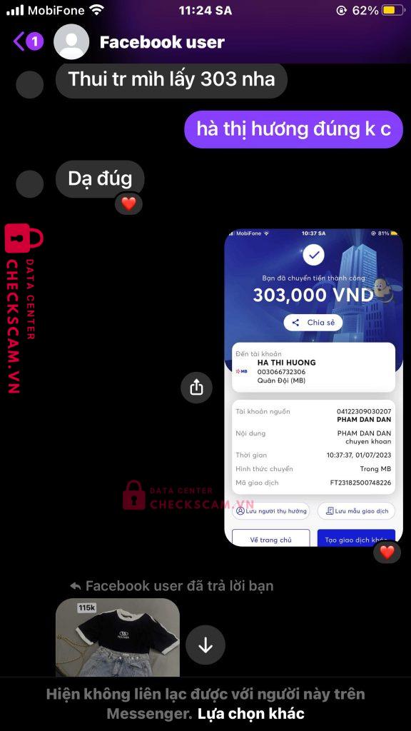 Scammer Alert: Hà Thị Hương Reported: November 16, 2024 Scammer Information Full Name: Hà Thị Hương Payment Gate: MB Bank Payment Account: 003066732306 Category: Marketplace scams Source: Checkscam Evidence Files Report Description chuyển tiền hàng rồi mà không giao đồ và chặn mình ạ Comments Your comment Add Comment No comments yet. Be the first to share your experience with this scammer.