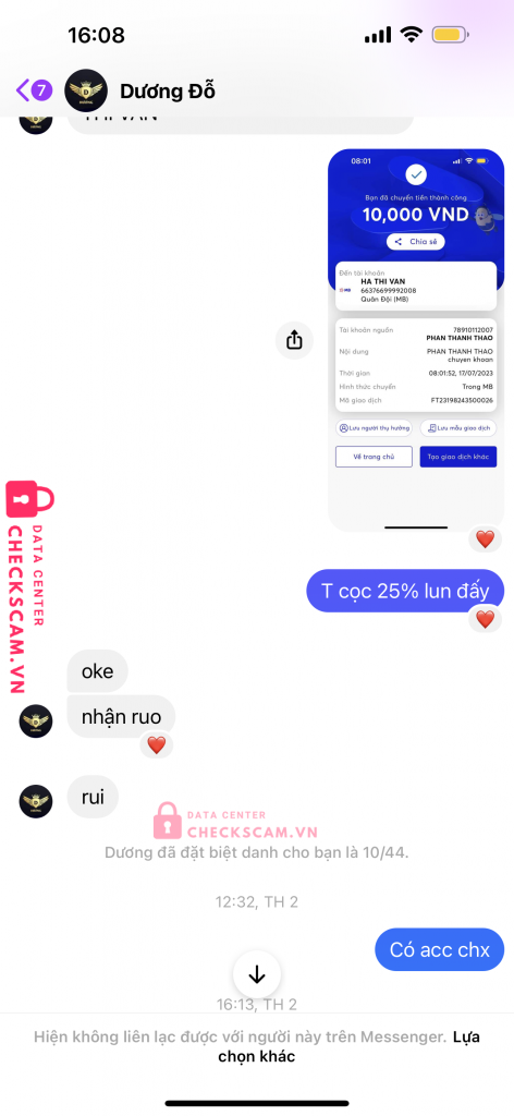 Scammer Alert: HA THI VAN Reported: November 16, 2024 Scammer Information Full Name: HA THI VAN Payment Gate: MB BANK Payment Account: 66376699992008 Category: Marketplace scams Source: Checkscam Evidence Files Report Description Scam Comments Your comment Add Comment No comments yet. Be the first to share your experience with this scammer.