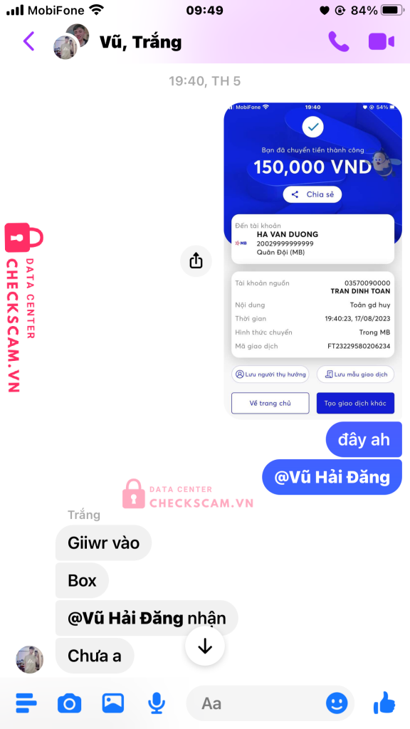 Scammer Alert: HA VAN DUONG Reported: November 16, 2024 Scammer Information Full Name: HA VAN DUONG Phone Number: 0931572155 Payment Gate: mbbank Payment Account: 20029999999999 Category: Marketplace scams Source: Checkscam Evidence Files Report Description Lừa đảo gdtg Comments Your comment Add Comment No comments yet. Be the first to share your experience with this scammer.