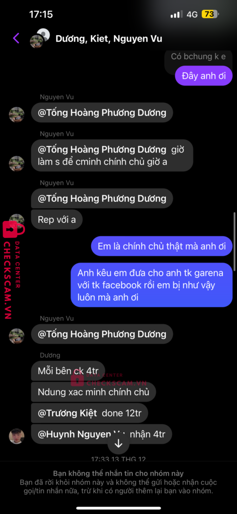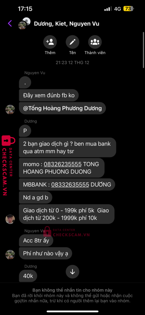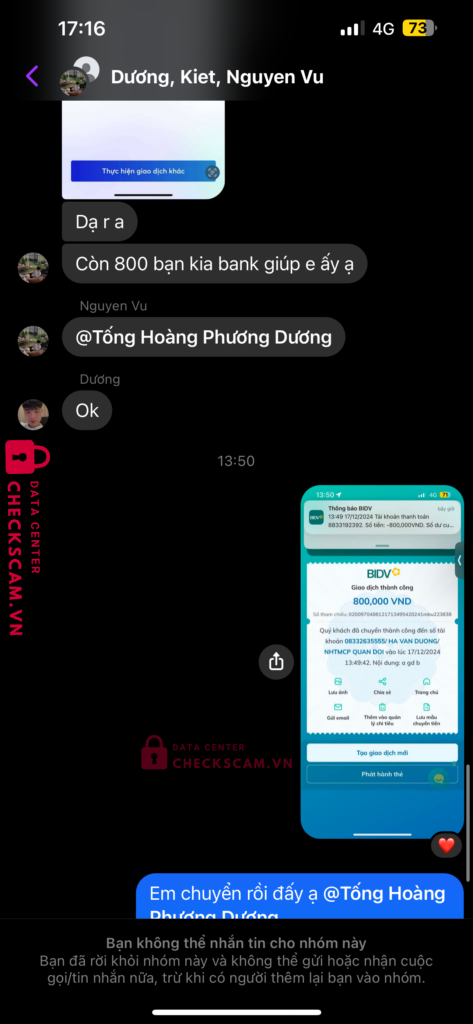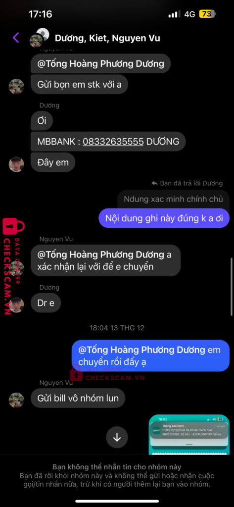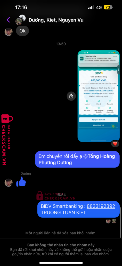 Scammer Alert: HA VAN DUONG Reported: March 7, 2025 Scammer Information Full Name: HA VAN DUONG Payment Gate: MB BANK Payment Account: 08332635555 Category: Marketplace scams Source: Checkscam Evidence Files Report Description Tôi cần tiền gấp để sinh hoạt thường ngày và đã gặp phải bọn lừa đảo này Comments Your comment Add Comment No comments yet. Be the first to share your experience with this scammer.