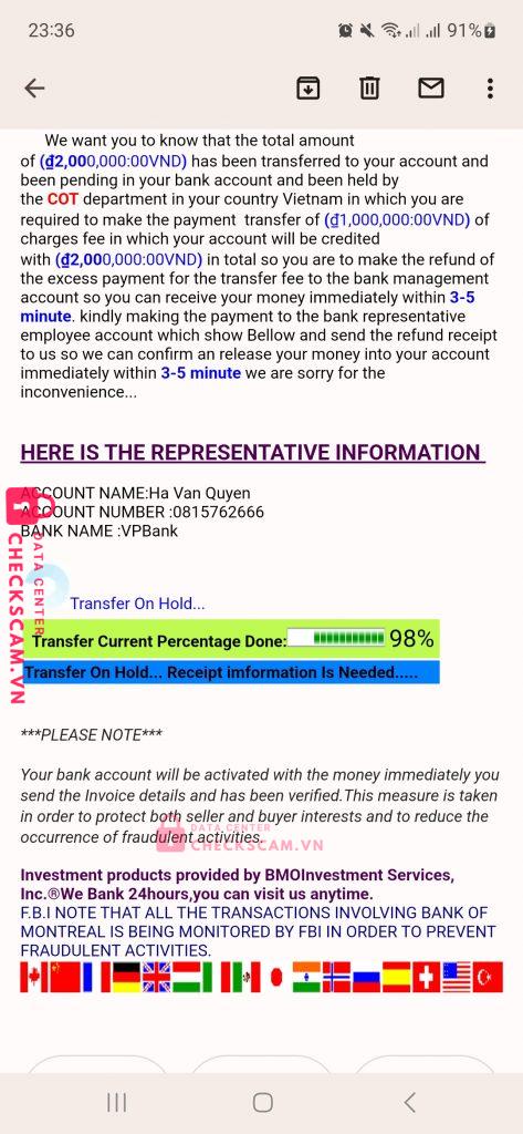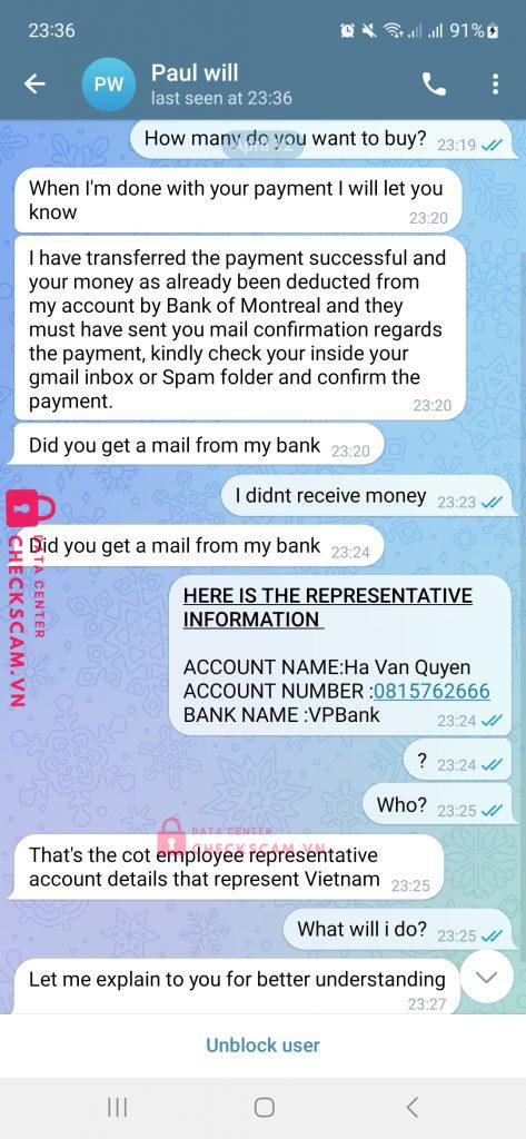 Scammer Alert: Ha van quyen Reported: November 16, 2024 Scammer Information Full Name: Ha van quyen Phone Number: 0815762666 Payment Gate: Vp bank Payment Account: 0815762666 Category: Marketplace scams Source: Checkscam Evidence Files Report Description Giả dạng người nc ngoài mua hàng trên chợ tốt rồi yêu cầu chuyển tiền vào tài khoản để xác nhận tài khoản. Comments Your comment Add Comment No comments yet. Be the first to share your experience with this scammer.