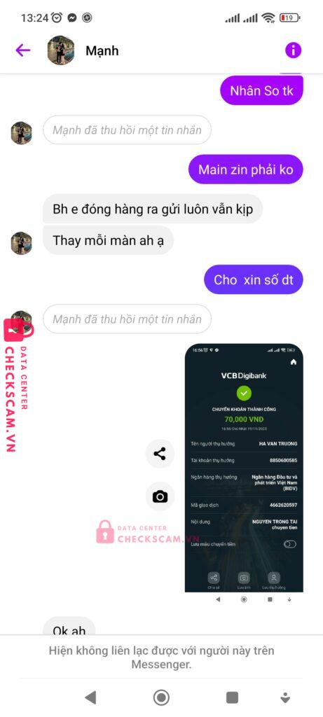 Scammer Alert: Hà Văn truong Reported: November 16, 2024 Scammer Information Full Name: Hà Văn truong Payment Gate: Bidv Payment Account: 8850600585 Category: Marketplace scams Source: Checkscam Evidence Files Report Description Cọc xong chặn Comments Your comment Add Comment No comments yet. Be the first to share your experience with this scammer.