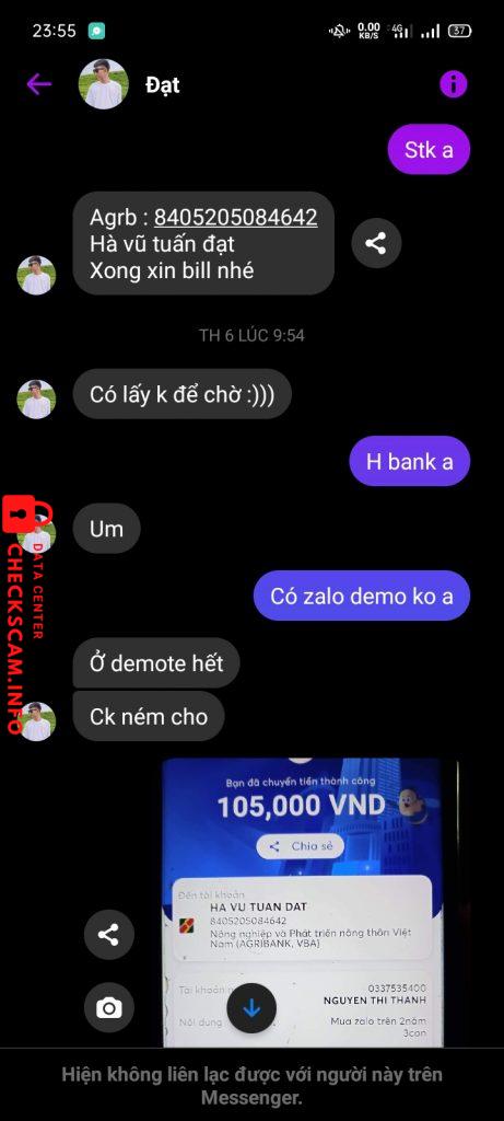 Scammer Alert: Hà Vũ Tuấn Đạt Reported: November 16, 2024 Scammer Information Full Name: Hà Vũ Tuấn Đạt Payment Gate: Agrb Payment Account: 8405205084642 Category: Marketplace scams Source: Checkscam Evidence Files Report Description Mua zalo ck xong block Comments Your comment Add Comment No comments yet. Be the first to share your experience with this scammer.