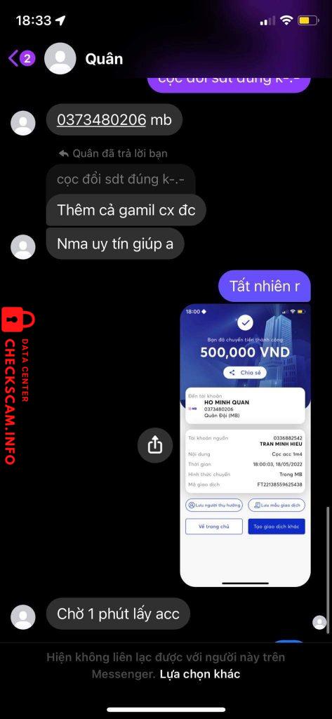 Scammer Alert: HO MINH QUAN Reported: November 16, 2024 Scammer Information Full Name: HO MINH QUAN Phone Number: 0373480206 Payment Gate: MB BANK Payment Account: 0373480206 Category: Marketplace scams Source: Checkscam Evidence Files Report Description Mua acc liên quân 1m4 gửi tiền cọc xong bị scam Comments Your comment Add Comment No comments yet. Be the first to share your experience with this scammer.