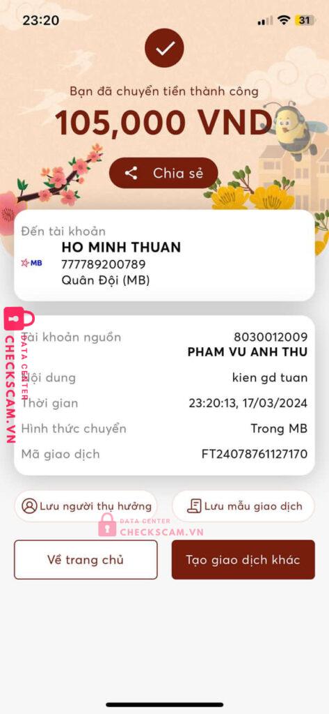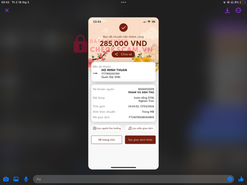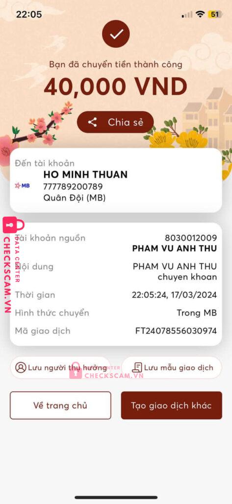 Scammer Alert: Ho Minh Thuan Reported: November 16, 2024 Scammer Information Full Name: Ho Minh Thuan Payment Gate: MBBank Payment Account: 777789200789 Category: Marketplace scams Source: Checkscam Evidence Files Report Description Gdtg scam link check scam fake, nó lừa t 670k Comments Your comment Add Comment No comments yet. Be the first to share your experience with this scammer.