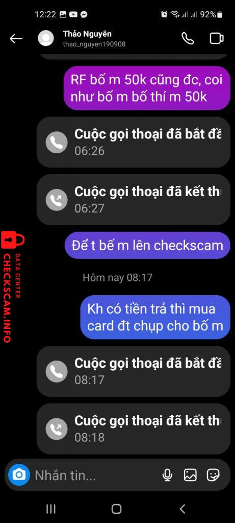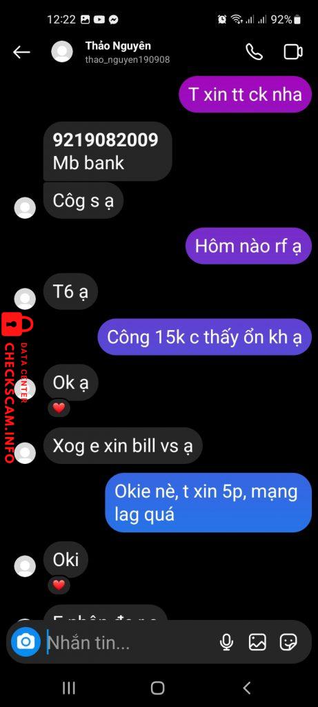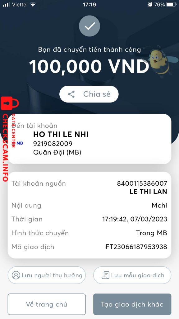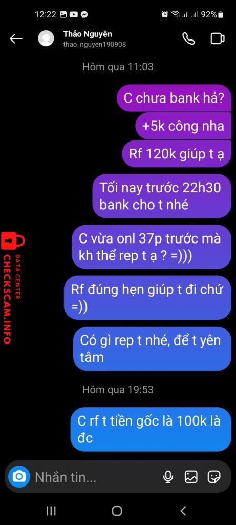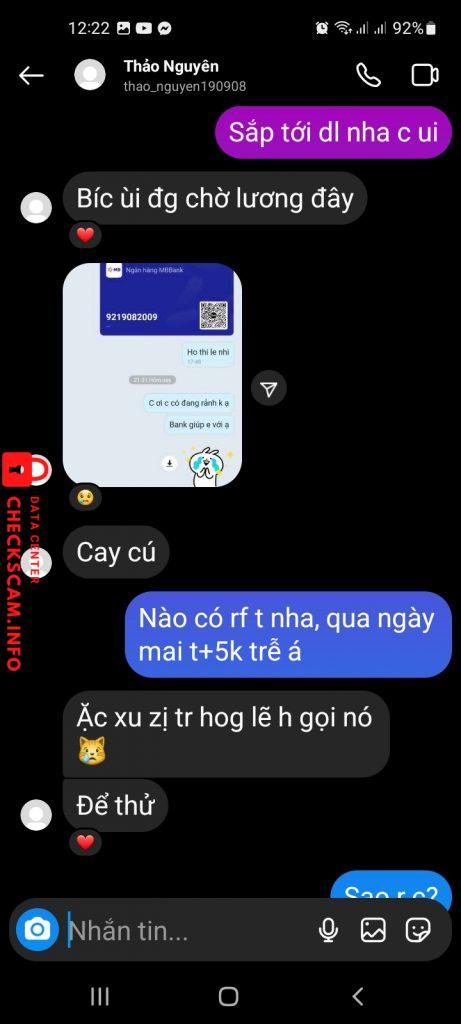Scammer Alert: Ho Thi Le Nhi Reported: November 16, 2024 Scammer Information Full Name: Ho Thi Le Nhi Payment Gate: MB Bank Quân Đội Payment Account: 9219082009 Category: Marketplace scams Source: Checkscam Evidence Files Report Description Lừa tiền bằng việc chuyển khoản hộ, sau khi đến deadline thì không seen, không rep ib trong khi vẫn online, cmt bài viết như bình thường Comments Your comment Add Comment No comments yet. Be the first to share your experience with this scammer.
