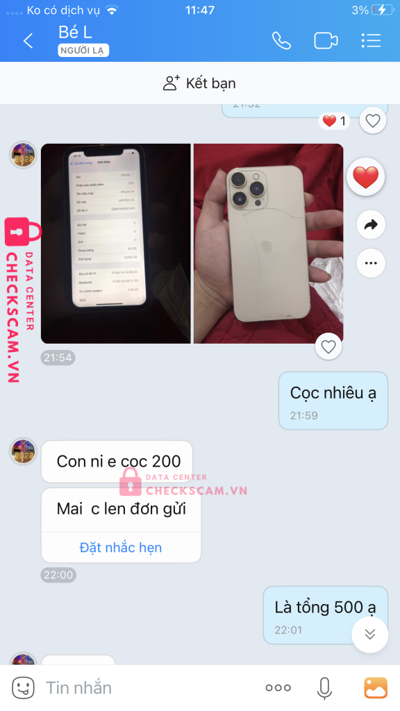 Bạn đó giới thiệu bán điện thoại giá rẻ, thấy bạn đó upp bill uy tín nên mình cũng tin, mình đặt đt bạn kia bắt cọc, mình cọc xong bạn đó block mình luôn