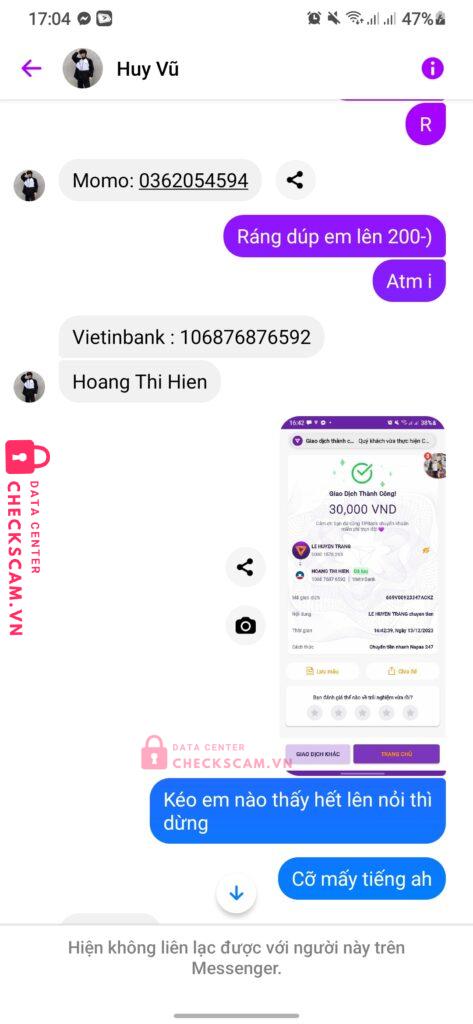 Scammer Alert: HOAN THI HIEN Reported: November 16, 2024 Scammer Information Full Name: HOAN THI HIEN Payment Gate: Vietinbank Payment Account: 106876876592 Category: Marketplace scams Source: Checkscam Evidence Files Report Description Lúc đầu ảnh kêu em góp vốn chs game tx xog mấy h sau em có 30k em bank xog ảnh nói đợi r chụp gửi em mấy tay ảnh ăn rồi xog ảnh block em Comments Your comment Add Comment No comments yet. Be the first to share your experience with this scammer.