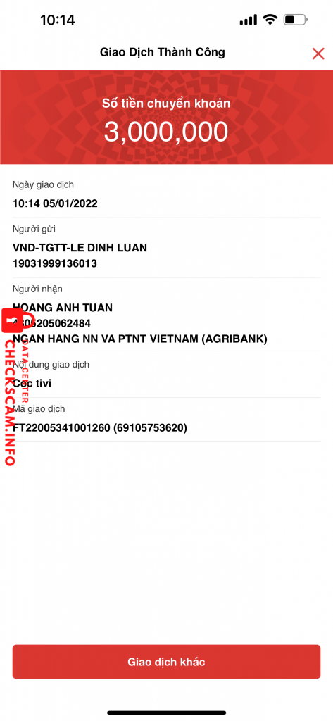 Scammer Alert: Hoàng Anh Tuấn Reported: November 16, 2024 Scammer Information Full Name: Hoàng Anh Tuấn Payment Gate: Agribank Payment Account: 4805205062484 Category: Marketplace scams Source: Checkscam Evidence Files Report Description Nó đi lừa bán ti vi báo cọc và lấy uy tín 1 shop ở sơn tây Comments Your comment Add Comment No comments yet. Be the first to share your experience with this scammer.