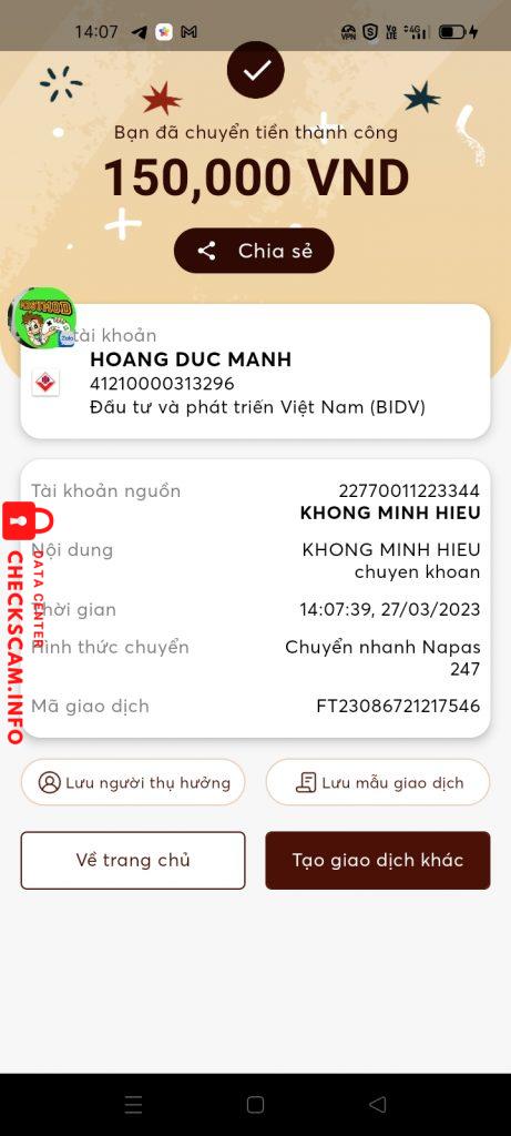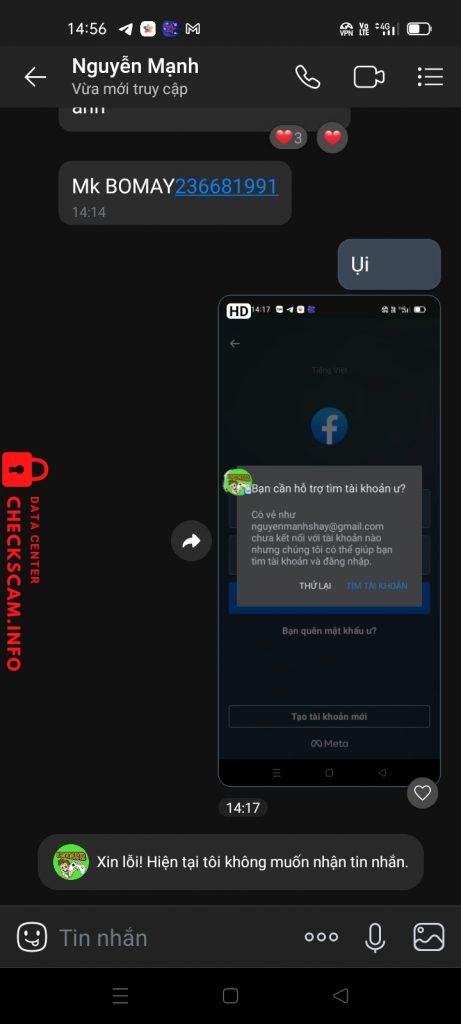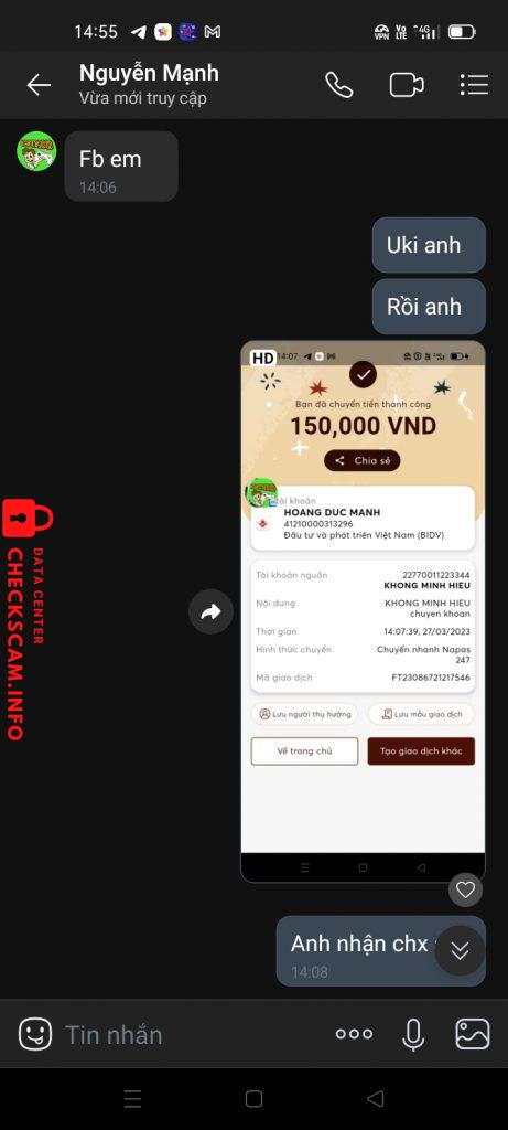 Scammer Alert: HOANG DUC MANH Reported: November 16, 2024 Scammer Information Full Name: HOANG DUC MANH Payment Gate: Bidv Payment Account: 41210000313296 Category: Marketplace scams Source: Checkscam Evidence Files Report Description Scam Tài Khoản Acc, Mod Hack Comments Your comment Add Comment No comments yet. Be the first to share your experience with this scammer.