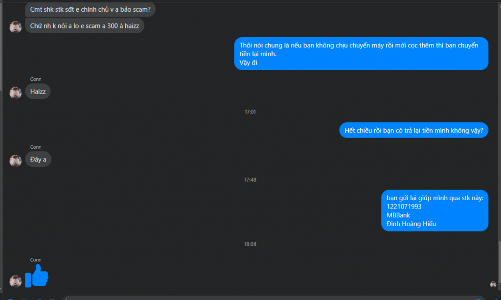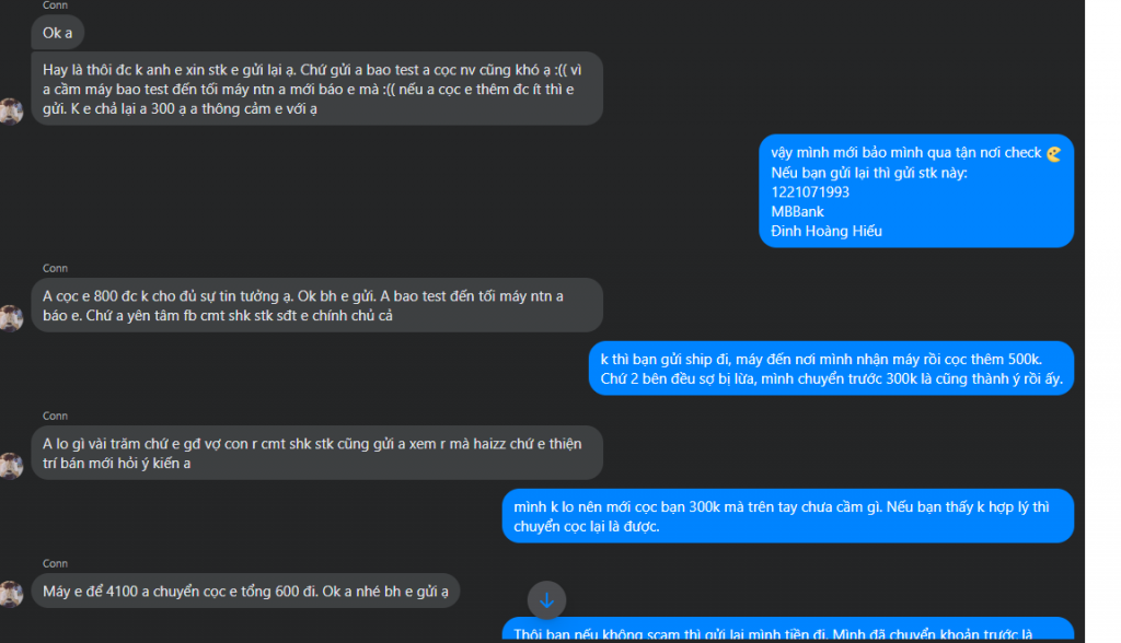Tk FB Lâm Conn (Tên thật Hoàng Hữu Lâm) đăng bán điện thoại cũ trên Market. Khi mình bảo muốn kiểm tra tận nơi thì tỏ vẻ không muốn. Bảo đặt shipper ship cho mình. Yêu cầu đặt cọc 300k tiền ship. Sau khi chuyển cọc thì lại đòi cọc thêm 500k nữa.