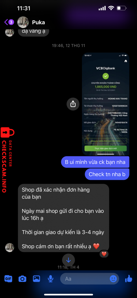 Scammer Alert: Hoàng Mai Trang Reported: November 16, 2024 Scammer Information Full Name: Hoàng Mai Trang Payment Gate: Viettinbank Payment Account: 105873099624 Category: Marketplace scams Source: Checkscam Evidence Files Report Description Lừa đảo tạo trang đăng sale Ck truoc gửi 100% tiền r nhưng không giao hàng trả khách …. Comments Your comment Add Comment No comments yet. Be the first to share your experience with this scammer.