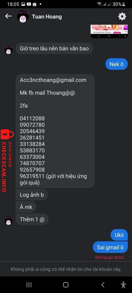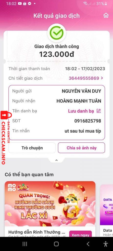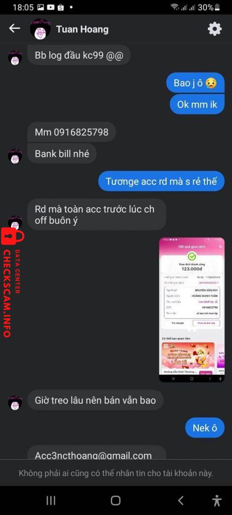 Scammer Alert: Hoàng Mạnh Tuân Reported: November 16, 2024 Scammer Information Full Name: Hoàng Mạnh Tuân Phone Number: 0916825798 Payment Gate: Momo Payment Account: 0916825798 Category: Marketplace scams Source: Checkscam Evidence Files Report Description Scam back acc Comments Your comment Add Comment No comments yet. Be the first to share your experience with this scammer.