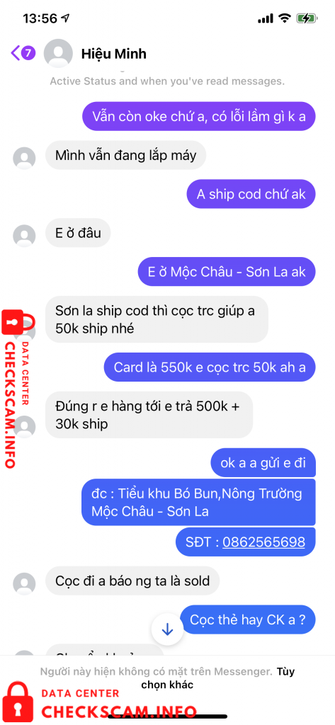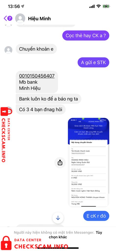 Scammer Alert: Hoang Minh Hieu Reported: November 16, 2024 Scammer Information Full Name: Hoang Minh Hieu Payment Gate: MB Bank Payment Account: 0010150456407 Category: Marketplace scams Source: Checkscam Evidence Files Report Description Có nội dung lừa đảo tôi Comments Your comment Add Comment No comments yet. Be the first to share your experience with this scammer.