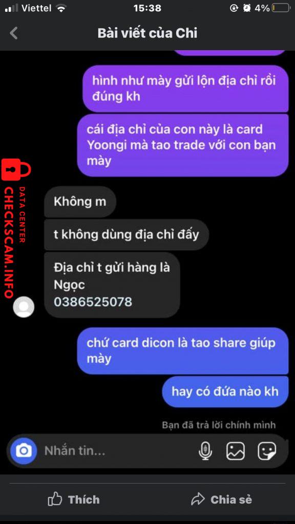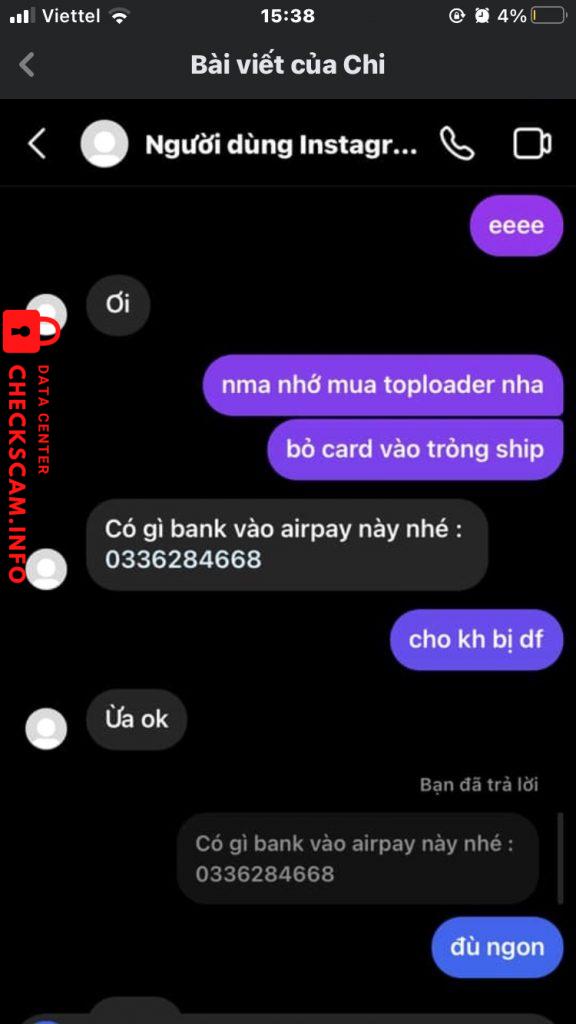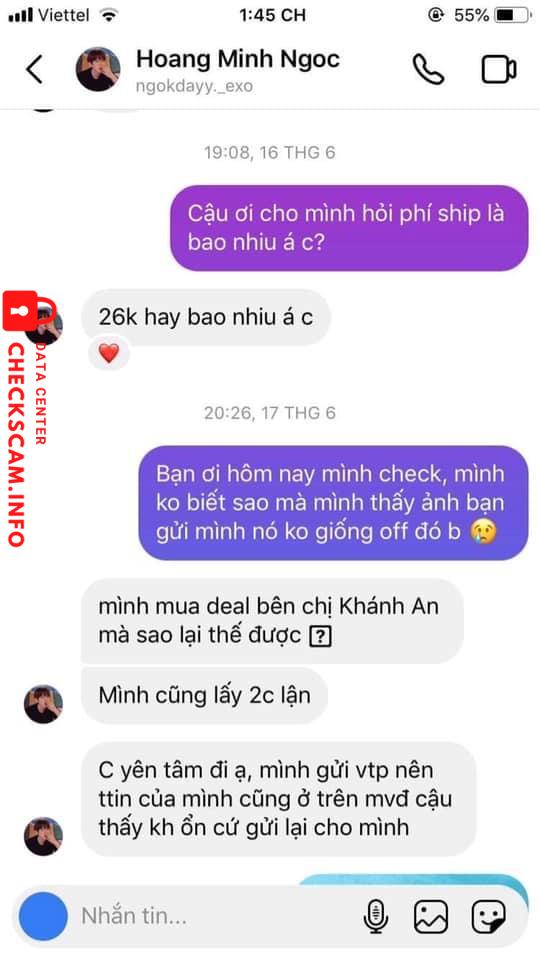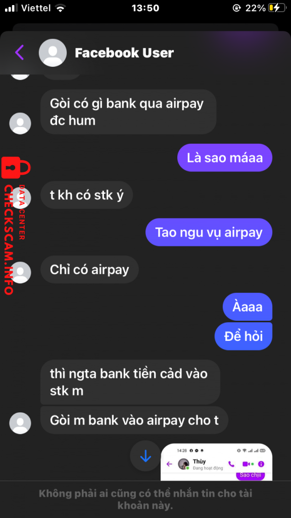 Scammer Alert: Hoàng Mình Ngọc Reported: November 16, 2024 Scammer Information Full Name: Hoàng Mình Ngọc Phone Number: 0336284668 Payment Gate: Momo Payment Account: 0336284668 Category: Marketplace scams Source: Checkscam Evidence Files Report Description Lừa đảo Comments Your comment Add Comment No comments yet. Be the first to share your experience with this scammer.