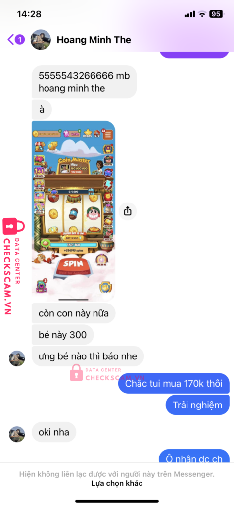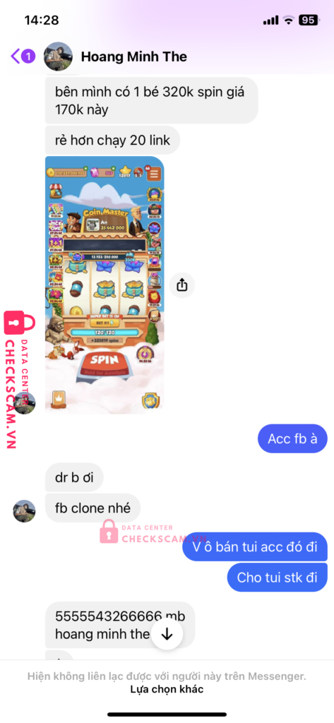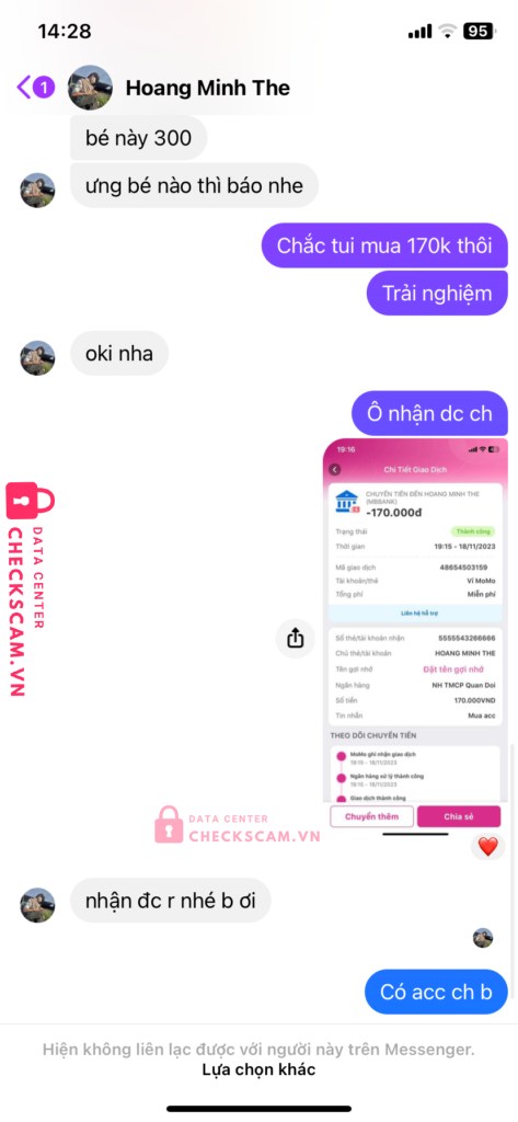 Scammer Alert: HOANG MINH THE Reported: November 16, 2024 Scammer Information Full Name: HOANG MINH THE Payment Gate: Mb bank Payment Account: 5555543266666 Category: Marketplace scams Source: Checkscam Evidence Files Report Description Lừa đảo Comments Your comment Add Comment No comments yet. Be the first to share your experience with this scammer.