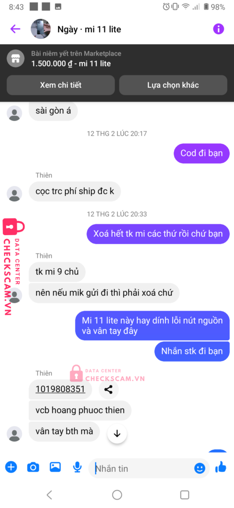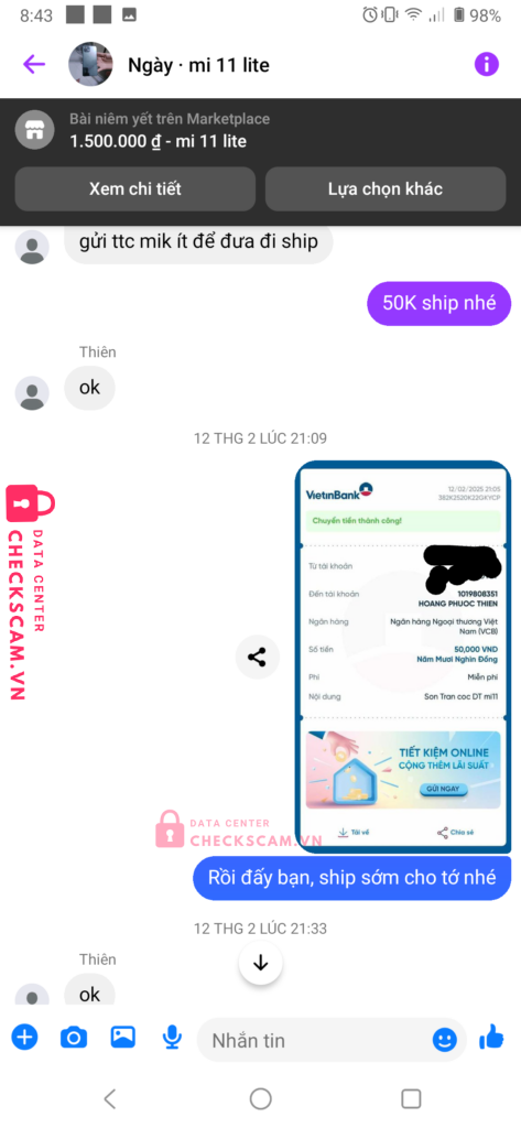 Scammer Alert: Hoàng Phước Thiên Reported: March 7, 2025 Scammer Information Full Name: Hoàng Phước Thiên Payment Gate: VCB Payment Account: 1019808351 Category: Marketplace scams Source: Checkscam Evidence Files Report Description Tài khoản lừa đảo tiền đặt cọc điện thoại, đồ điện tử. Mong ad duyệt cảnh báo mọi người. Comments Your comment Add Comment No comments yet. Be the first to share your experience with this scammer.
